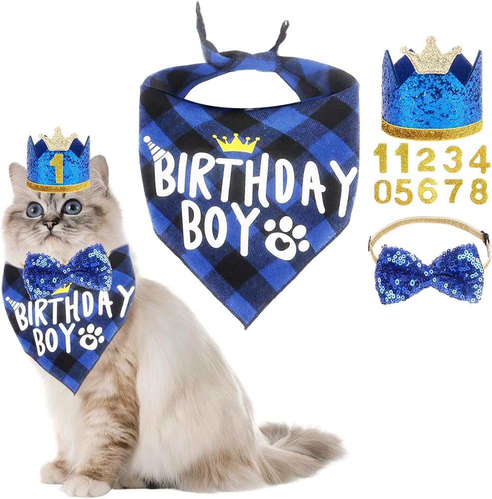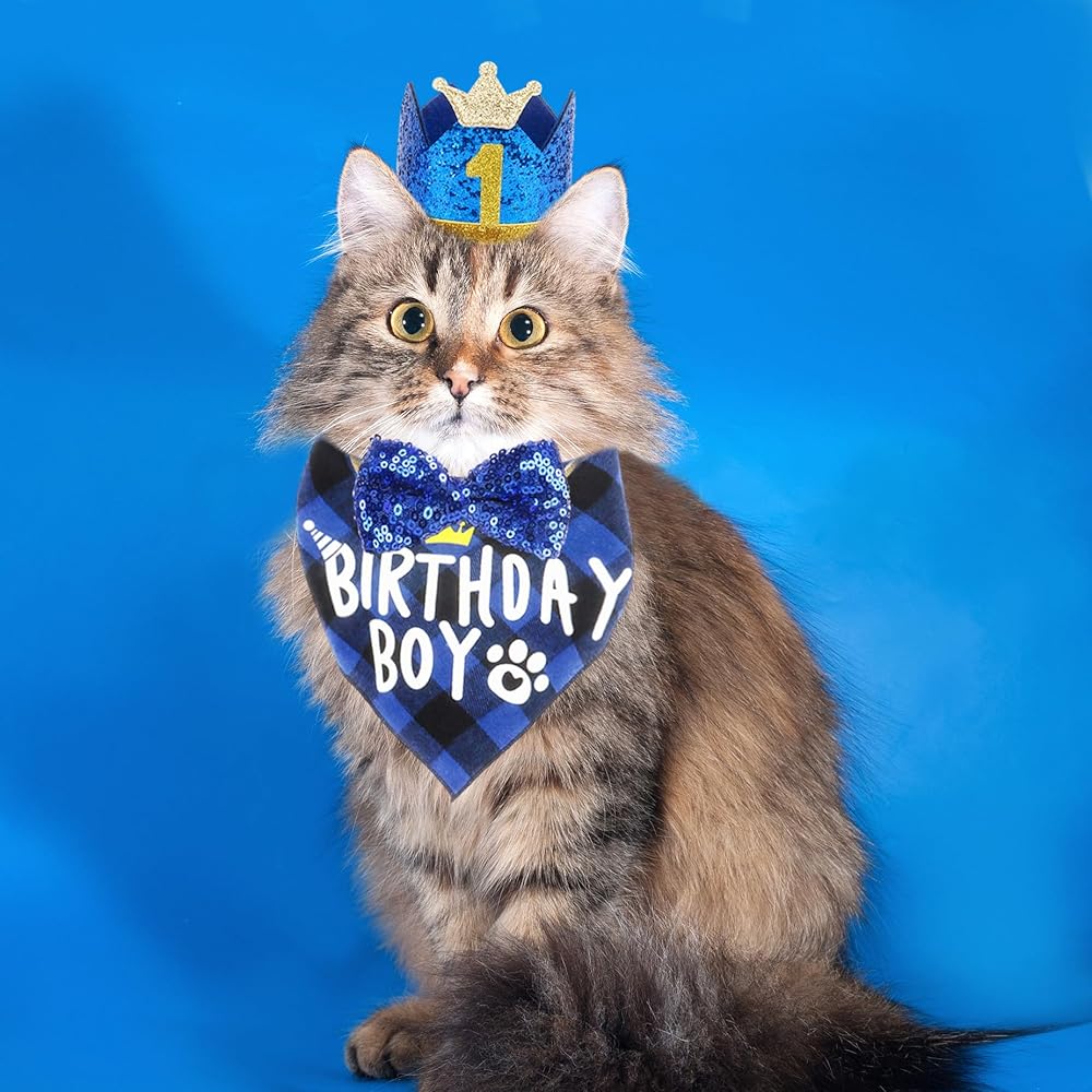 • Cat Birthday Decorations : This cat party decorations kit includes a crown (with age numbers:0-8), a birthday bandana, and a bow tie. Perfect for creating a festive atmosphere at your cat's birthday celebration or any cat themed birthday party.