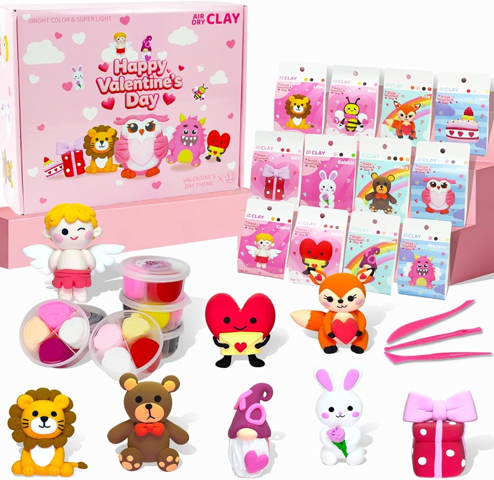 مجموعة الطين الجاف بالهواء لعيد الحب للأطفال - 12 صندوقًا من مجموعات الحرف اليدوية المصنوعة من الطين مع أدوات النحت والبرامج التعليمية لتبادل الهدايا في الفصل الدراسي، ومفضلات الحفلات، والأنشطة الفنية وهدايا عيد الحب