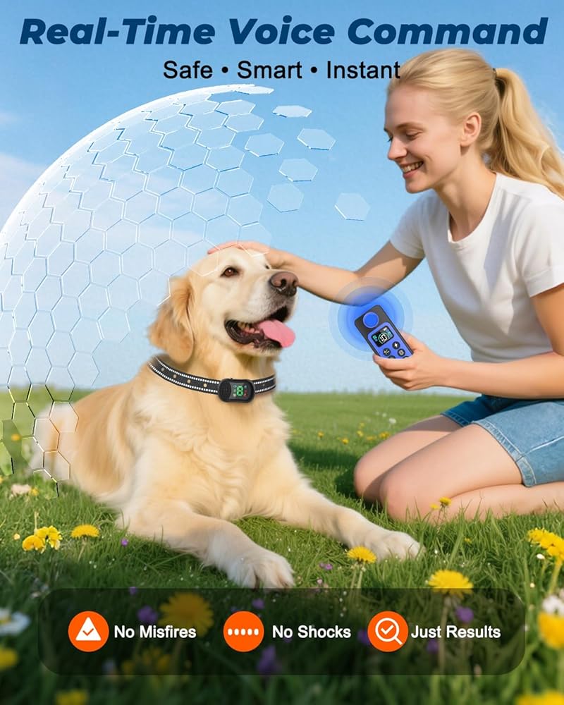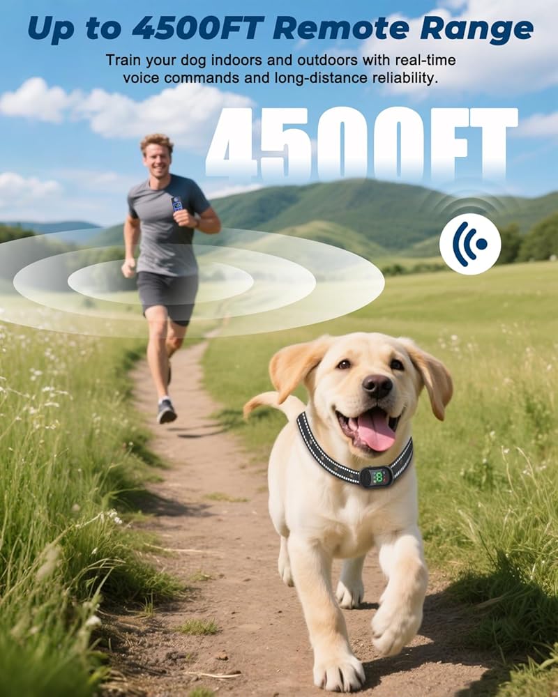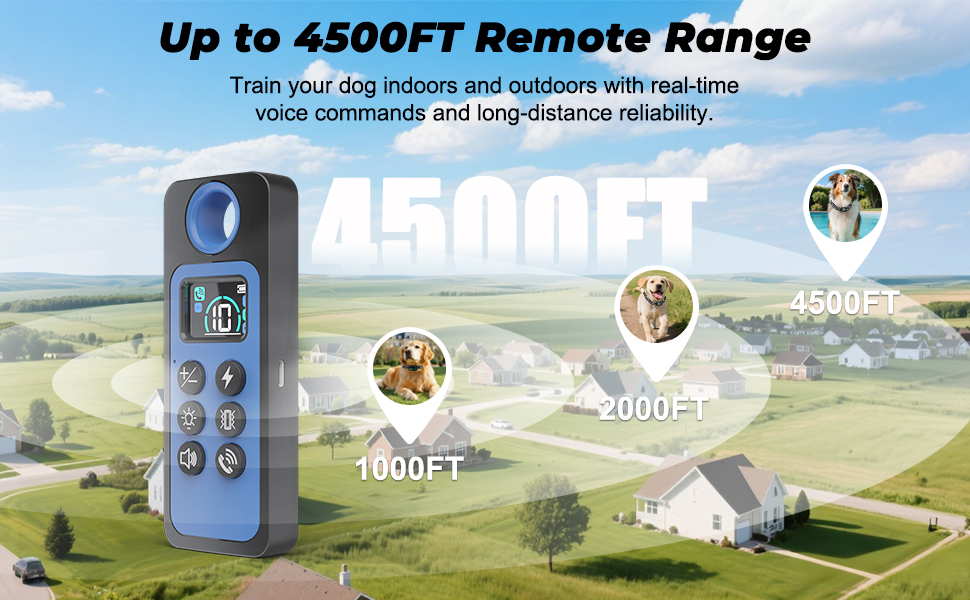 • نطاق تحكم عن بعد 4500 قدم مع التحكم الصوتي - يوفر طوق تدريب الكلاب هذا نطاق تحكم ممتد يصل إلى 4500 قدم، مما يسمح لك بإرسال أوامر صوتية في الوقت الحقيقي أو تصحيحات يدوية من مسافة بعيدة. تم تصميم جهاز التحكم عن بعد للتحكم الدقيق والسريع الاستجابة، مما يجعله مثاليًا لتدريب كلب واحد في بيئات مختلفة.