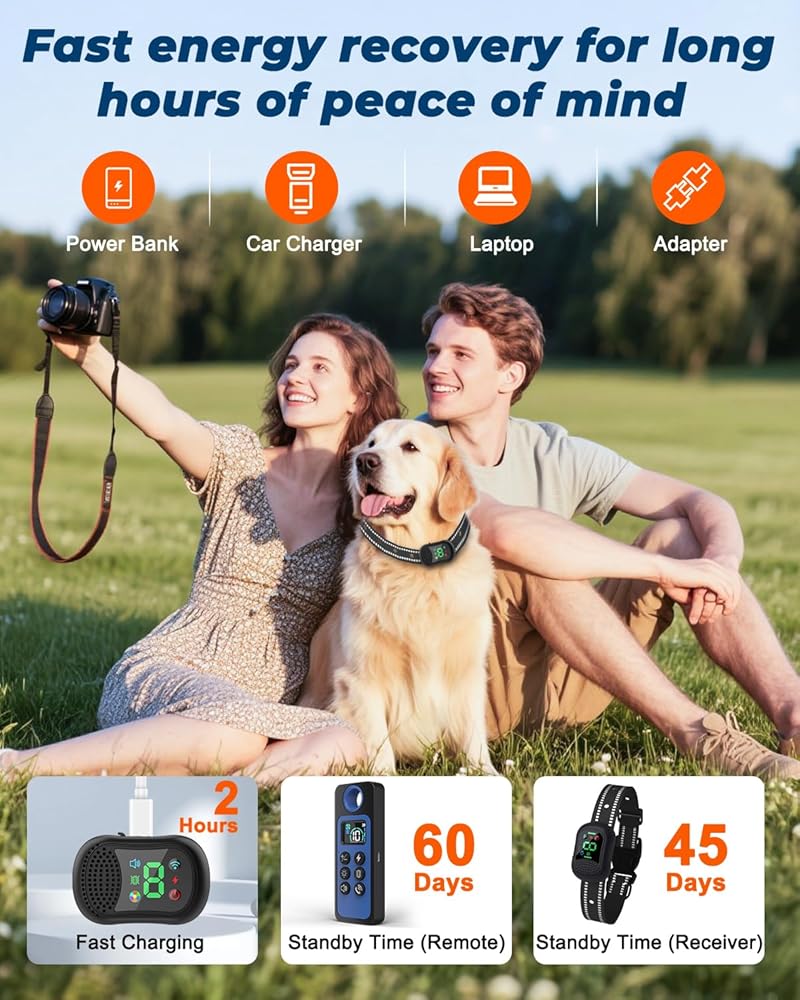 • شحن سريع وعمر بطارية طويل - تم تصميم نظام طوق الصدمات هذا للاستخدام المستمر، ويتميز ببطارية قابلة لإعادة الشحن تدوم حتى 60 يومًا على جهاز التحكم عن بعد و45 يومًا على جهاز الاستقبال. مزود بمنفذ شحن من النوع C، ويمكن إعادة شحن كل من جهاز التحكم عن بعد وجهاز الاستقبال في غضون ساعات قليلة. على الرغم من أنه لا يتم الشحن في وقت واحد، إلا أن كل جهاز يدعم الشحن السريع، مما يجعله مثاليًا لتدريب الكلاب من جميع الأحجام، بدءًا من الجراء وحتى السلالات الكبيرة.