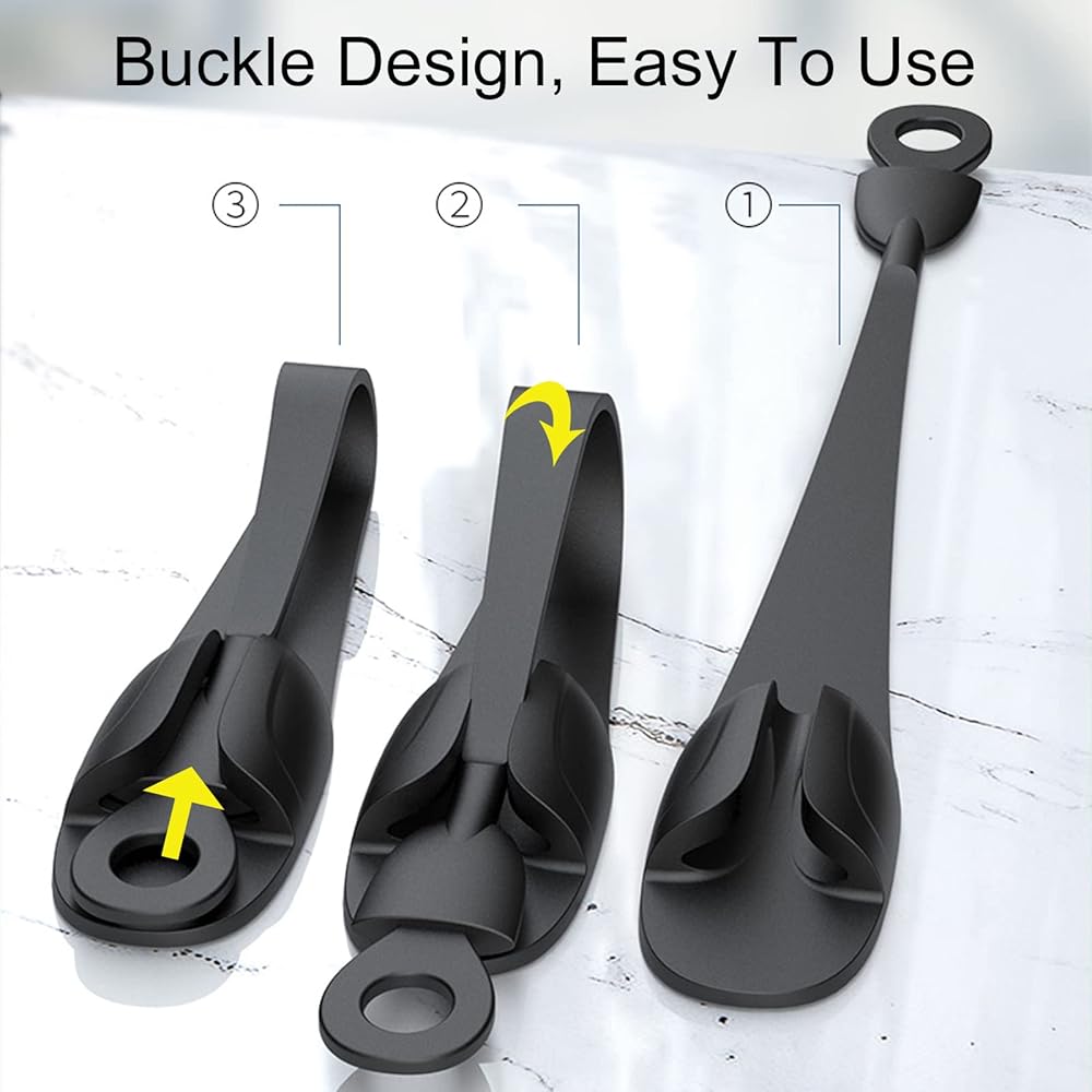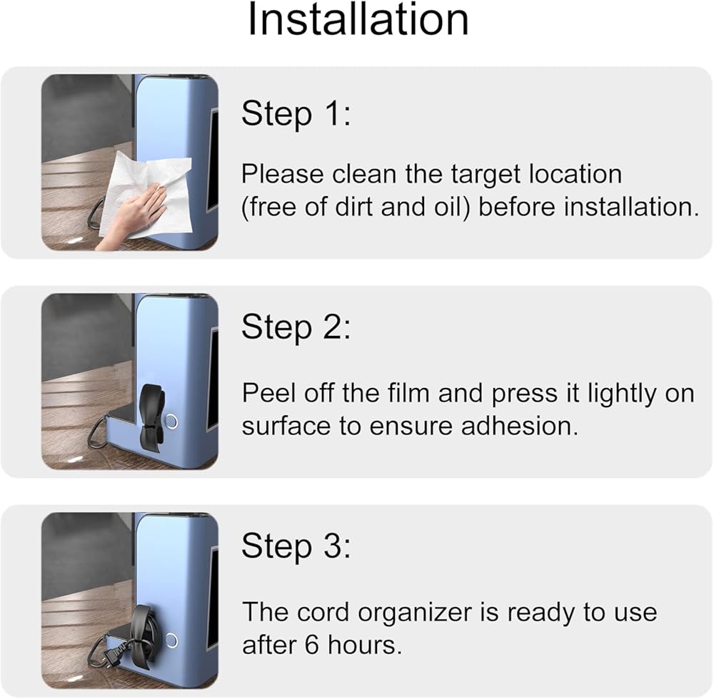 التثبيت - ما عليك سوى تنظيف سطح الجهاز أولاً، وتأكد من أن السطح جاف وخالي من الزيوت والأوساخ، ثم قشر الورقة الموجودة أسفل منظم سلك المطبخ وألصقها بالجهاز. في انتظار 6 ساعات للاستخدام. لفاف السلك: لف السلك وأمسك القابس في مكانه بشكل آمن. مجمع السلك: ضع الحبال على حزام التخزين وقم بتثبيتها في الإبزيم.