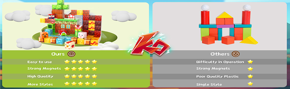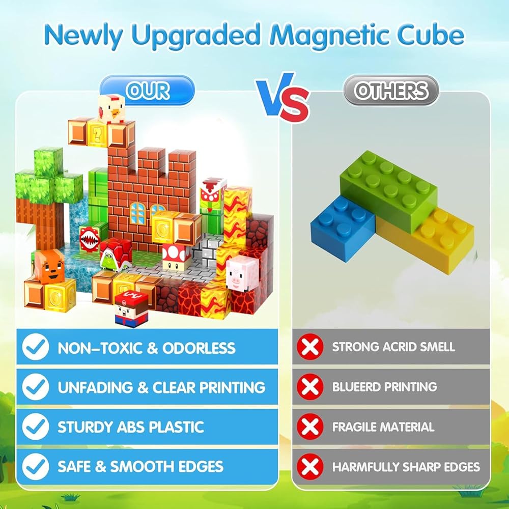 【مكعبات بناء مغناطيسية متينة وقوية】تم تصنيع المكعبات المغناطيسية الخاصة بنا من مواد فاخرة وتكنولوجيا طباعة متقدمة لضمان أن تتميز كل كتلة مغناطيسية بأنماط وألوان نابضة بالحياة، مع تحمل الضرر الناتج عن التأثيرات. بفضل الحجم المناسب والحواف الناعمة، تعمل هذه المكعبات المغناطيسية على تمكين الأطفال الصغار من تطوير المهارات الحركية الدقيقة أثناء بناء عوالم خيالية.