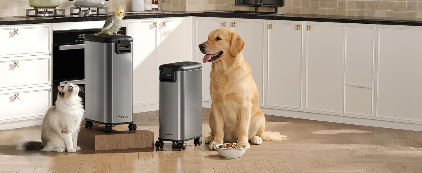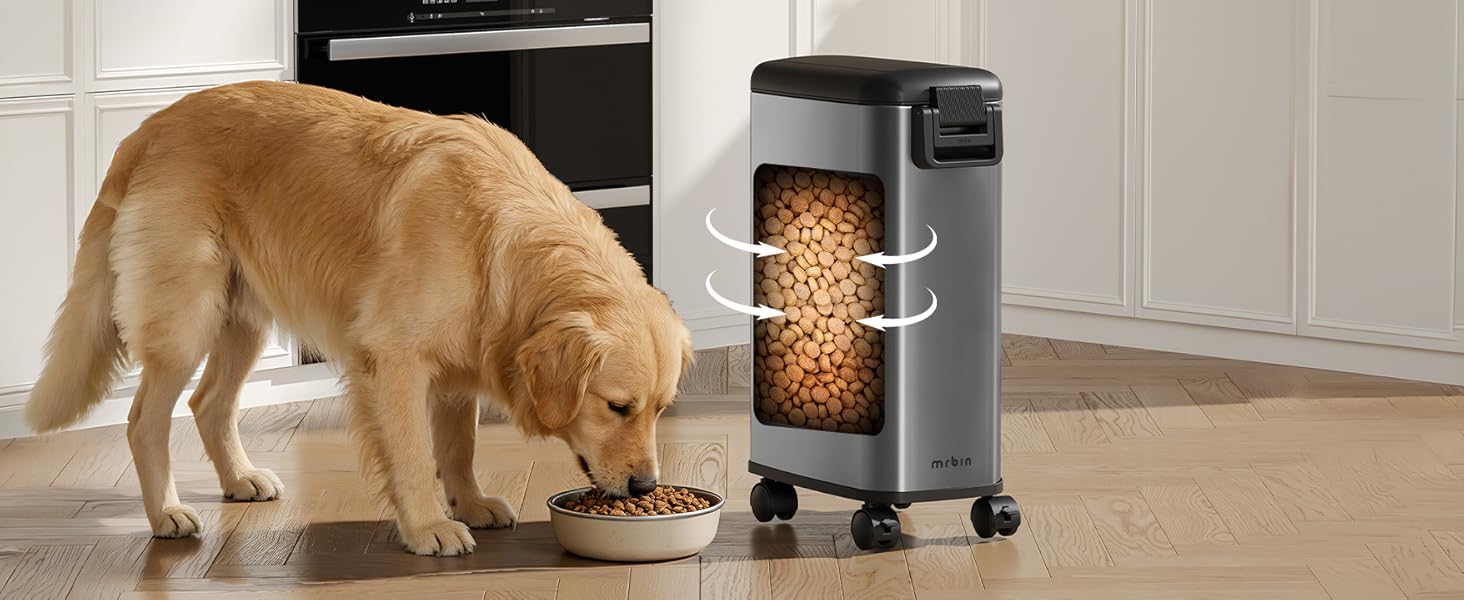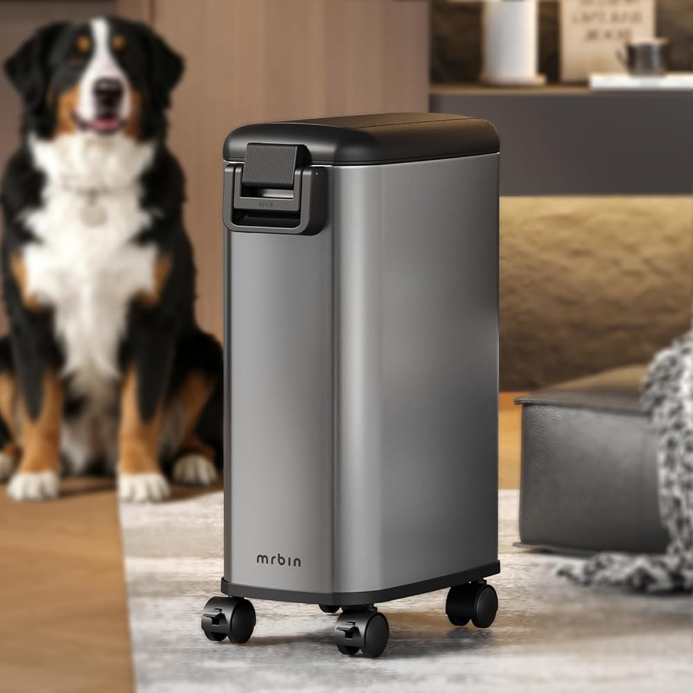 صندوق تخزين طعام الحيوانات الأليفة من MRBIN سعة 20 رطلاً، صندوق طعام للكلاب سعة 12 لترًا مع حاوية طعام الحيوانات الأليفة محكمة الغلق من الفولاذ المقاوم للصدأ مع عجلات، رمادي إكليبس