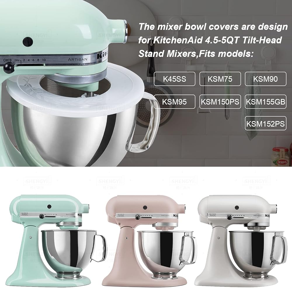 The mixer bowl covers are designed for KitchenAid 4.5-5QT Tilt-Head Stand Mixers, compatible with models: K45SS, KSM75, KSM90, KSM95, KSM150PS, KSM152PS, KSM155GB, and more.