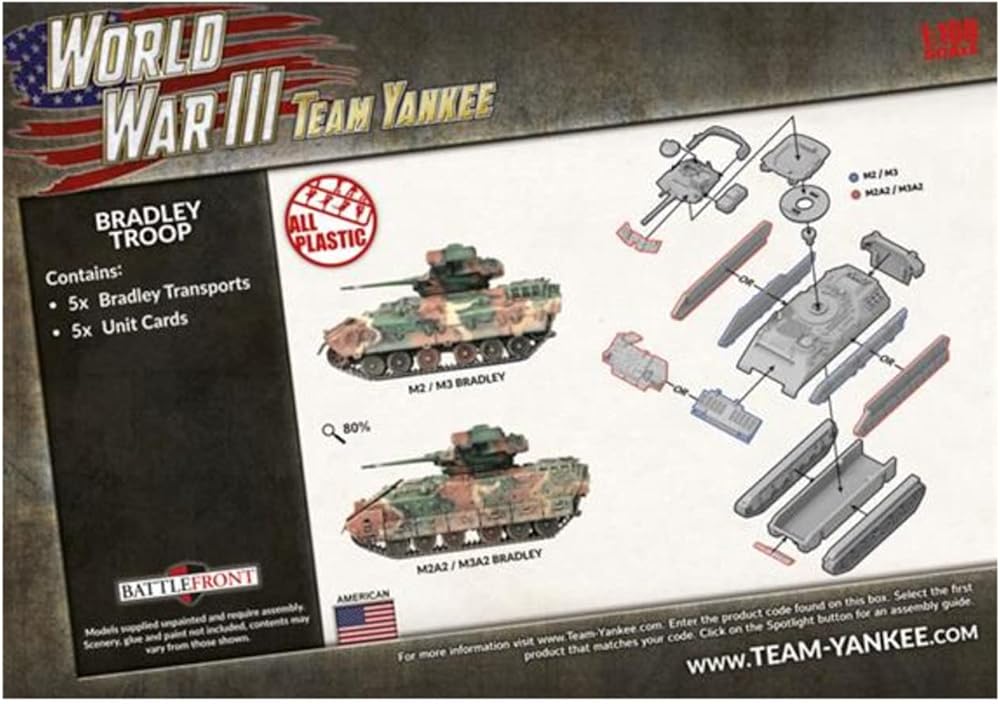 The M2 Bradley partially replaces the venerable M113 APC in some US Army formations and is also the American answer to the Infanty Fighting Vehicles (IFVs) fielded by many other nations. The M2 Bradley IFV is designed to allow mechanised infantry to keep up with the M1 Abrams main battle tank due to its comparable levels of battlefield manoeuvrability, while at the same time increasing the firepower available to those units with its turret mounted 25mm Bushmaster automatic cannon and TOW-2 anti-tank guided missiles. Carrying its infantry into the midst of the enemy and allowing them to fight ‘mounted' when required, the M2 Bradley IFV is anything but a simple battlefield taxi. The M2A2 was the first fundamental upgrade to the Bradley IFV. The vehicle's powerplant, transmission, and armour were all improved. The new configuration incorporated both laminated and spaced armour. The modifications resulted in the elimination of the systems which made the Bradley amphibious as well as the side firing ports, but allowed for the incorporation of explosive reactive armour making the A2 far better protected than the initial production models. A new Kevlar liner was included to protect the crew and troops inside the vehicle. Up to six infantry and their equipment could be carried, and the new turret armour configuration allowed for additional stowage space. THIS PRODUCT CONTAINS: 5x Bradley Transports or Scout Vehicles --- These miniatures are supplied unassembled and unpainted