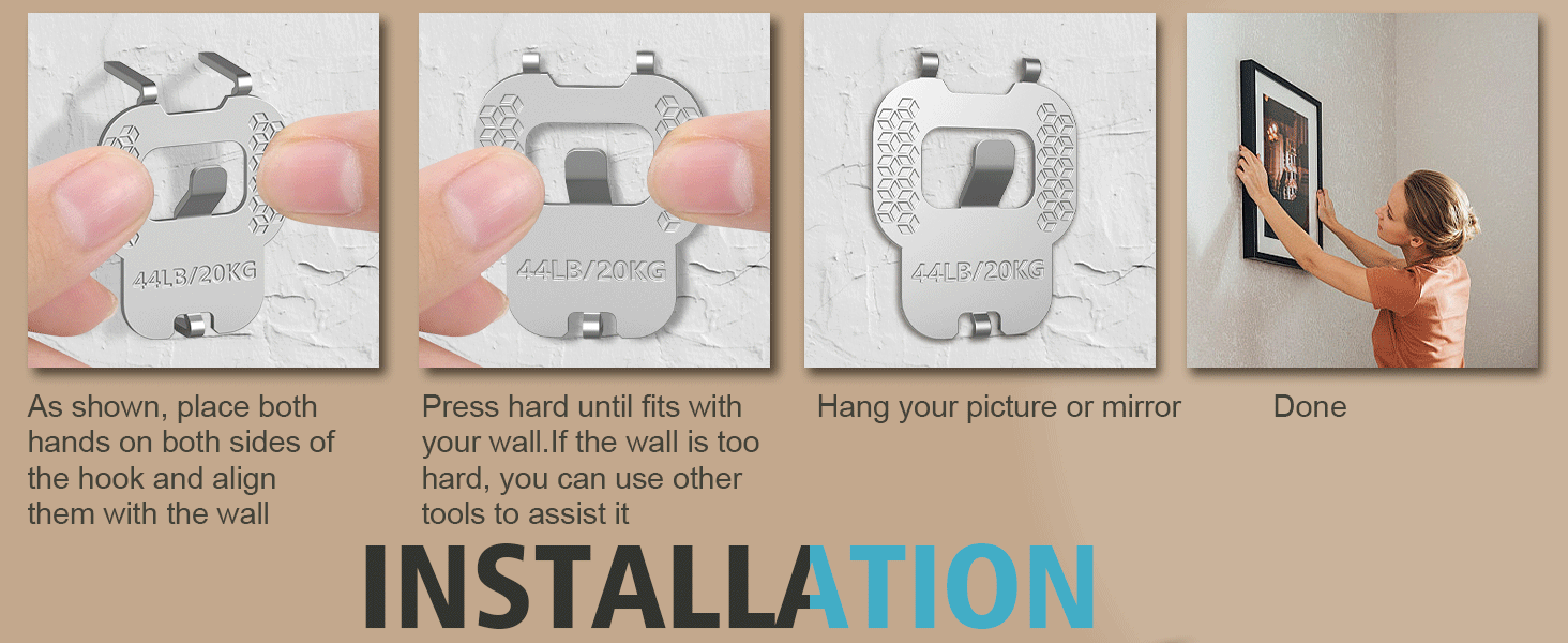 【تركيب بدون مجهود】ما عليك سوى الوضع والضغط والتعليق - لا حاجة إلى أدوات إضافية، مما يوفر لك الكثير من الوقت. تتميز المخالب الفولاذية الصلبة بتصميم مشطوف يتم تثبيته بدون مسامير جدارية.