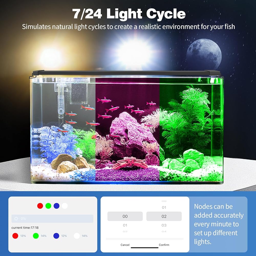 【إضاءة حوض السمك كاملة الطيف】تعتيم مجاني لإضاءة RGB ذات 4 قنوات للحصول على نتائج الطيف الكامل، وتعديل السطوع بنسبة 0-100%. خرزات مصباح LED عالية الجودة وألواح أكريليك تجعل مؤشر تجسيد اللون لضوء خزان الأسماك كامل الطيف يصل إلى 95%، مما يسمح للأسماك والنباتات بالنمو في بيئة قريبة من الموائل الطبيعية.