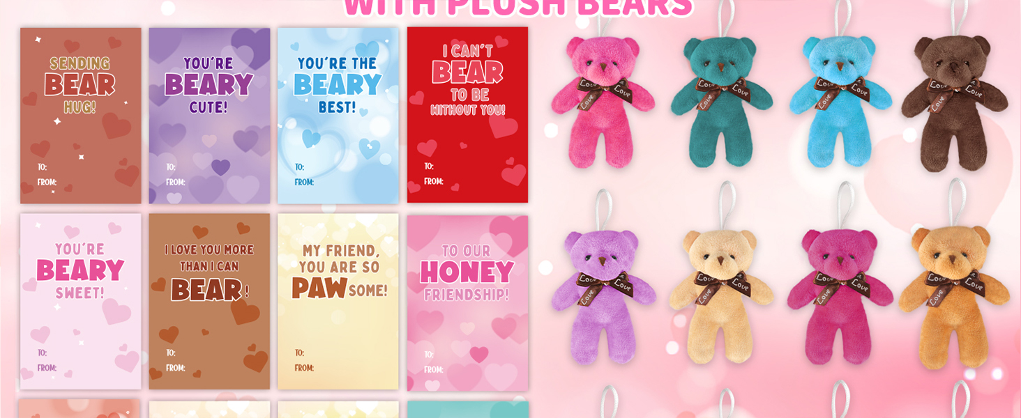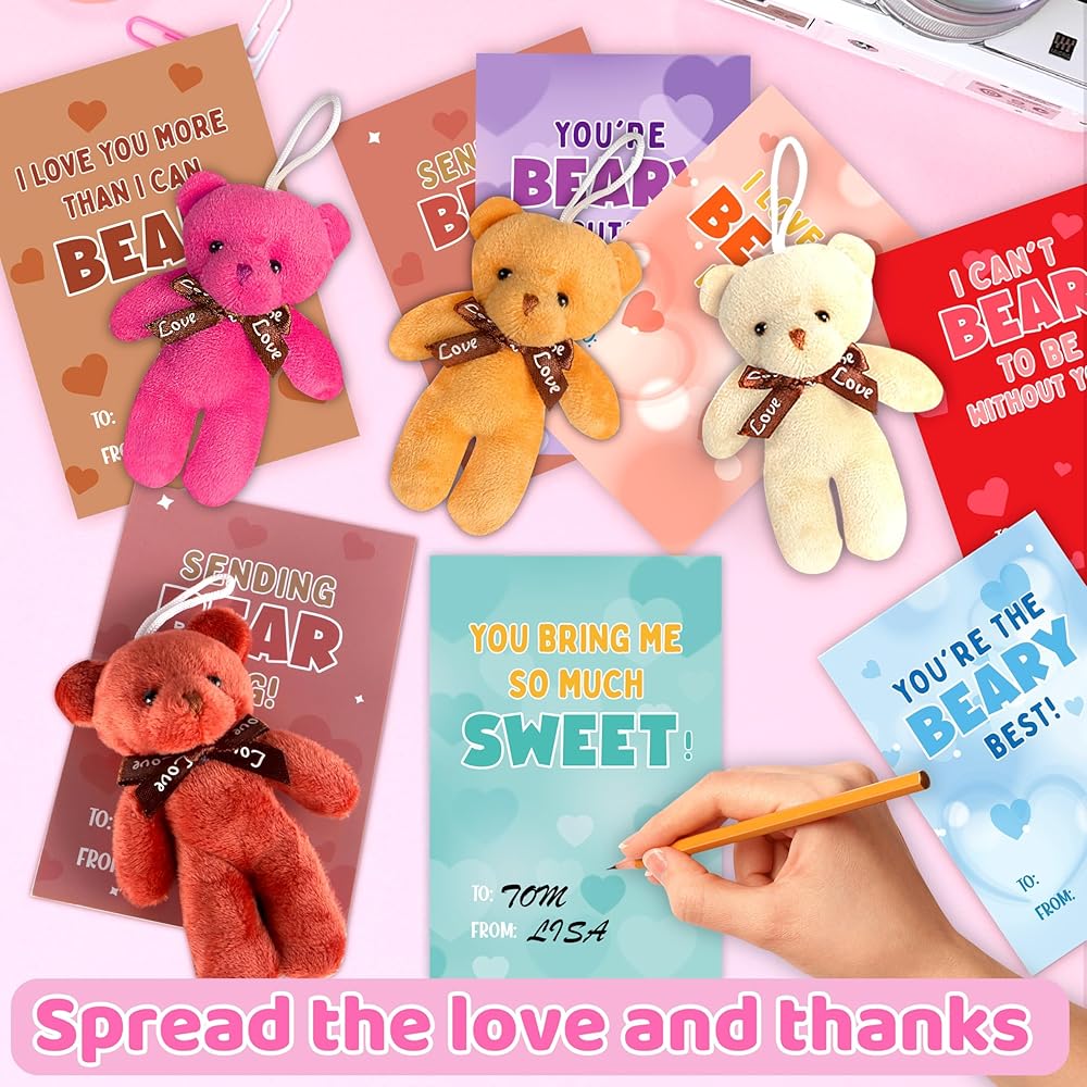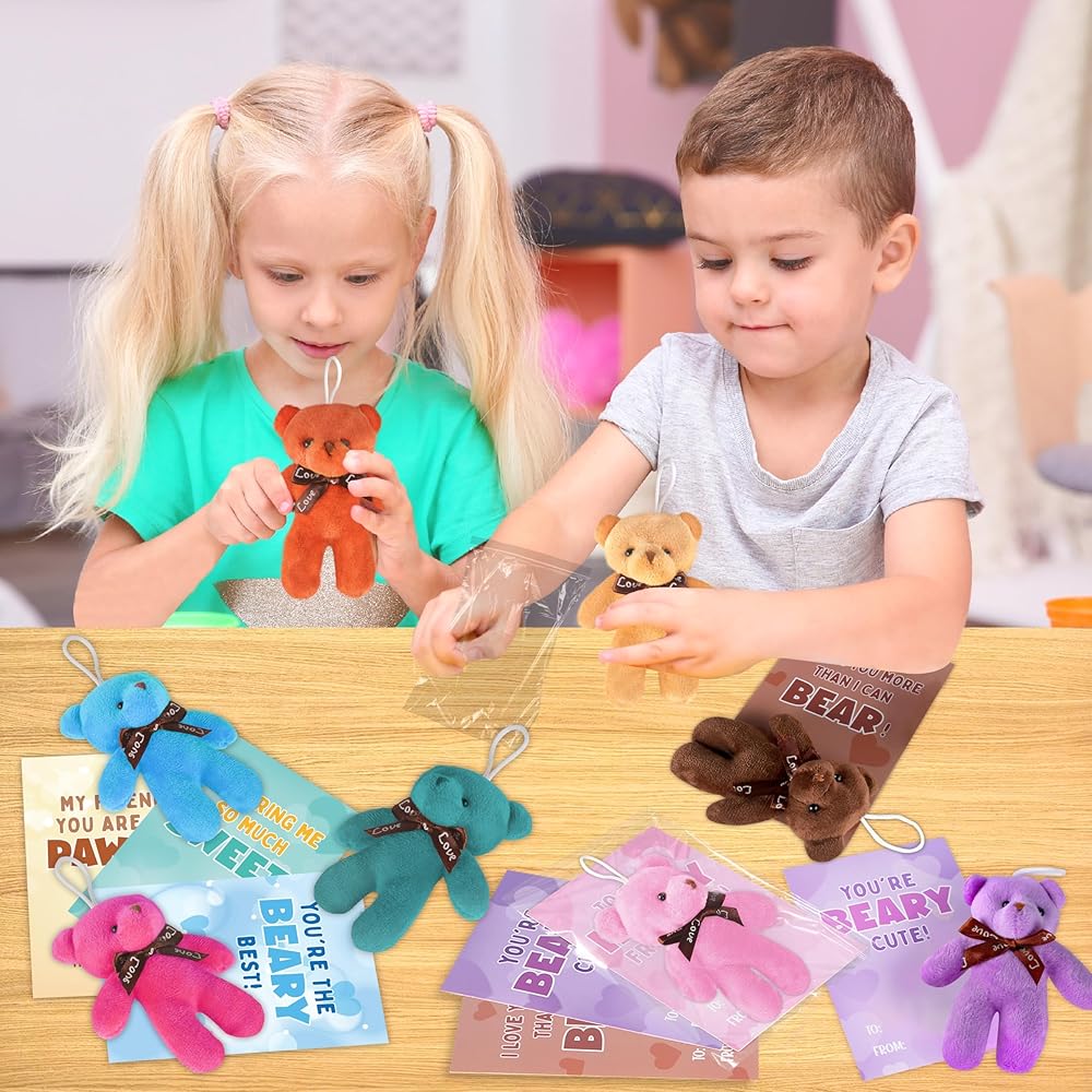 بطاقات عيد الحب للأطفال، 24 حزمة من لعبة الدببة الصغيرة القطيفة مع بطاقات عيد الحب، حيوان محشو صغير لتفضلات حفلات المدرسة للأطفال الأولاد والبنات، وتبادل هدايا عيد الحب للأطفال