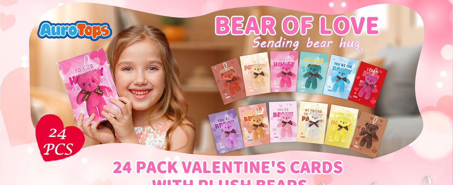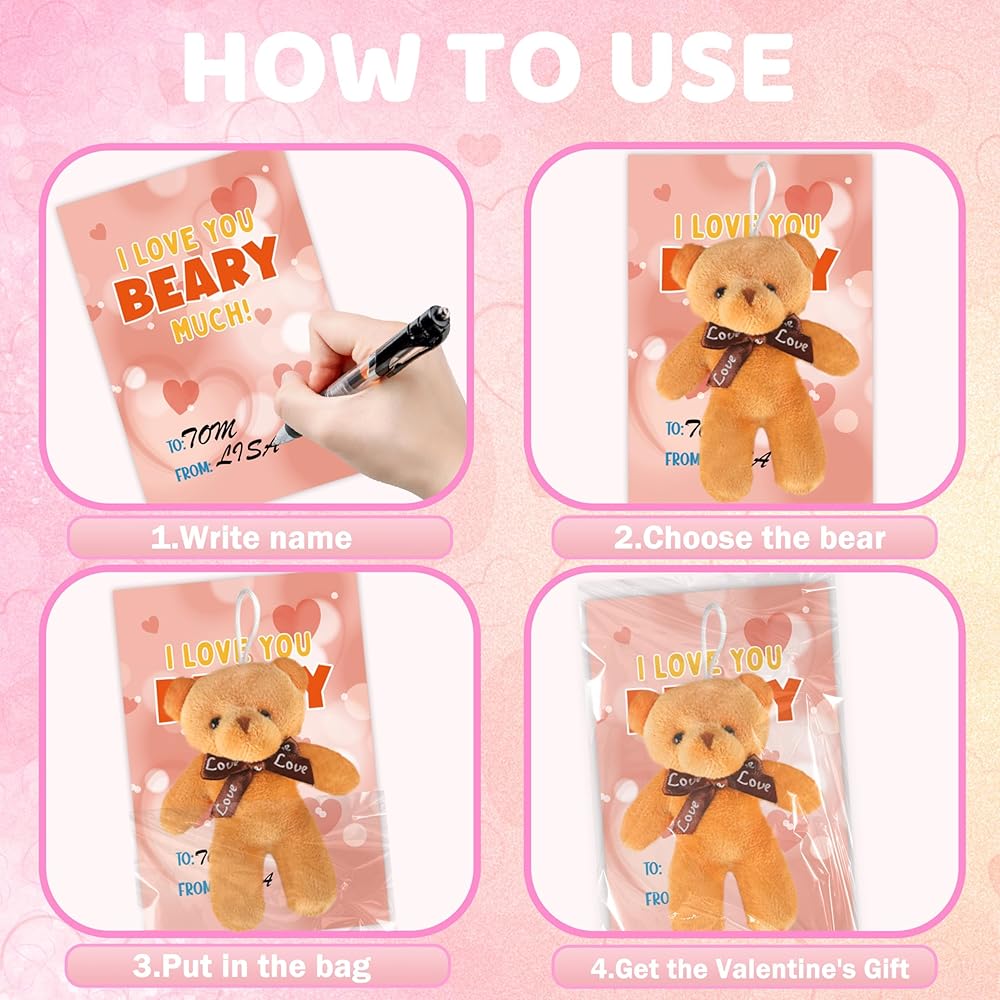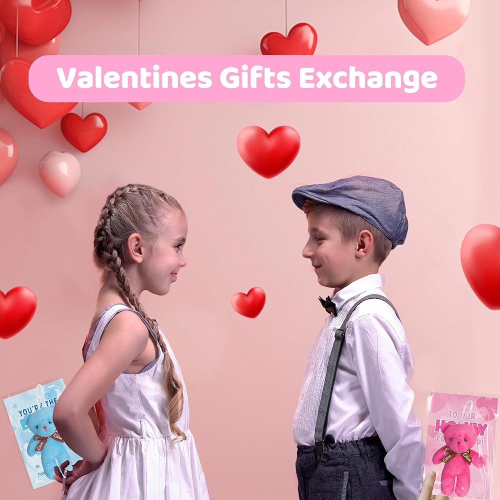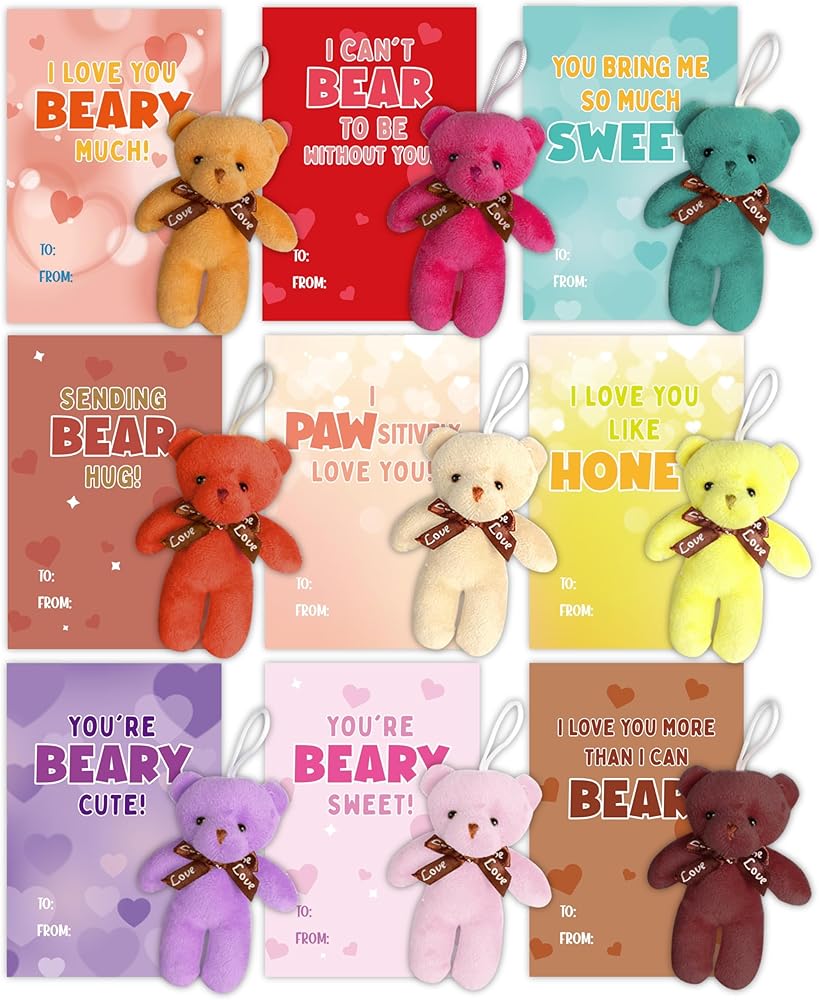 بطاقات عيد الحب للأطفال، 24 حزمة من لعبة الدببة الصغيرة القطيفة مع بطاقات عيد الحب، حيوان محشو صغير لتفضلات حفلات المدرسة للأطفال الأولاد والبنات، وتبادل هدايا عيد الحب للأطفال