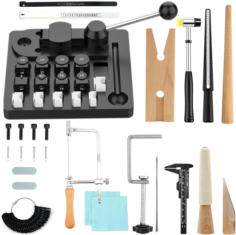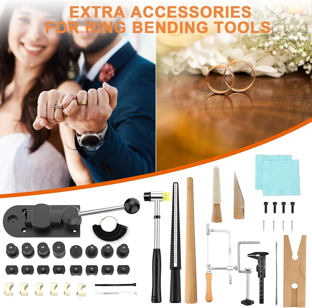 【آلة ثني الحلقات الاحترافية التي يمكنك صنعها بنفسك】تم تصميم مجموعة أدوات ثني الحلقات للمحترفين والمبتدئين، وتشتمل المجموعة على: قالب نايلون، ومطرقة مجوهرات مطاطية، وأداة قياس شريط حلقة معدنية، ومغزل حلقي، وقضيب تلميع وقماش، ونموذج دائري مكون من 27 قطعة ومقياس حجم الحلقة يمكن أن يكون لأداة ثني الحلقة مصممة للمعادن الثمينة الناعمة، وحفظ قلبك وجهدك، وتجعل صناعة المجوهرات بنفسك أسهل.