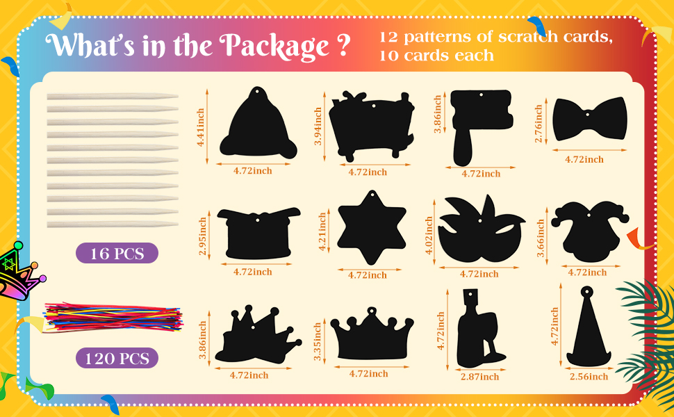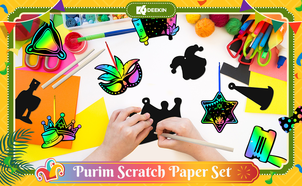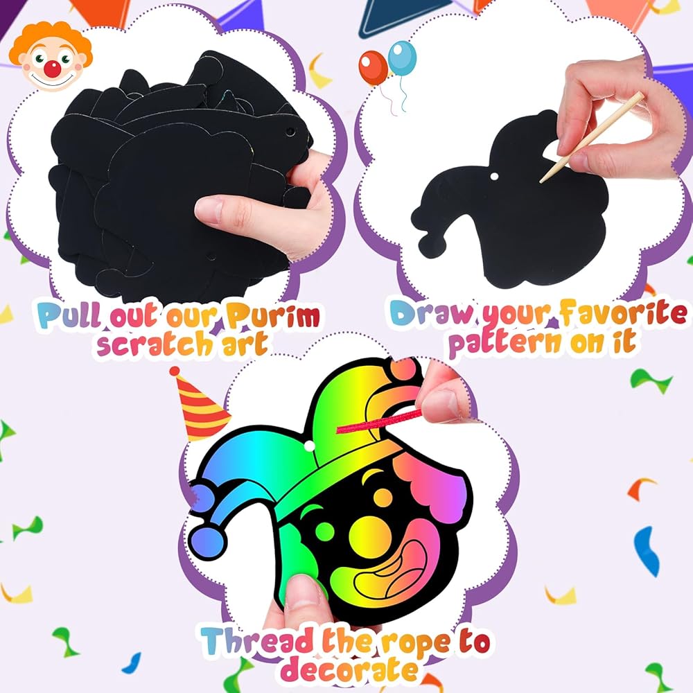 محتويات العبوة: تتضمن العبوة 120 بطاقة خدش ذات طابع بوريم، 10 من كل منها في 12 نمطًا، و60 عصا خشبية وحزمة من الأشرطة الملونة؛ العديد من الأنماط بما في ذلك الأقنعة والنجوم الستة المدببة والشمبانيا والنرجس والبسكويت وما إلى ذلك