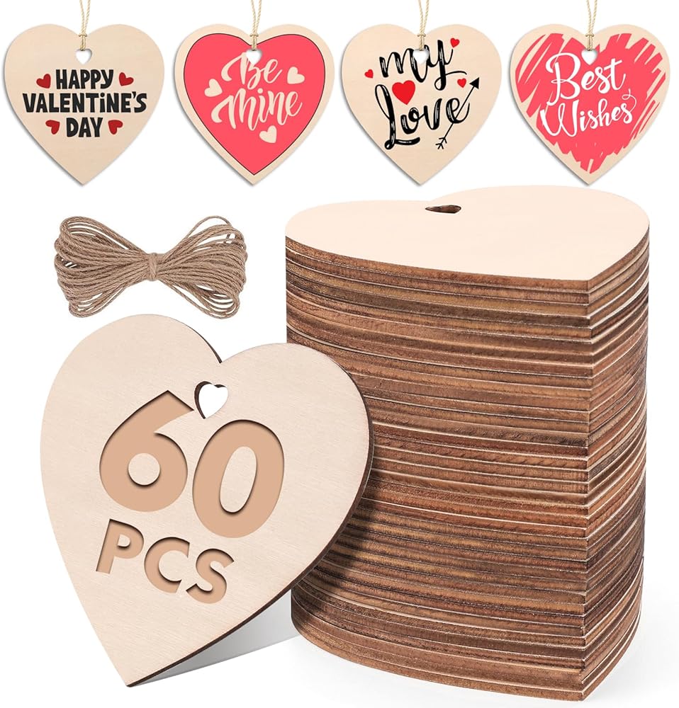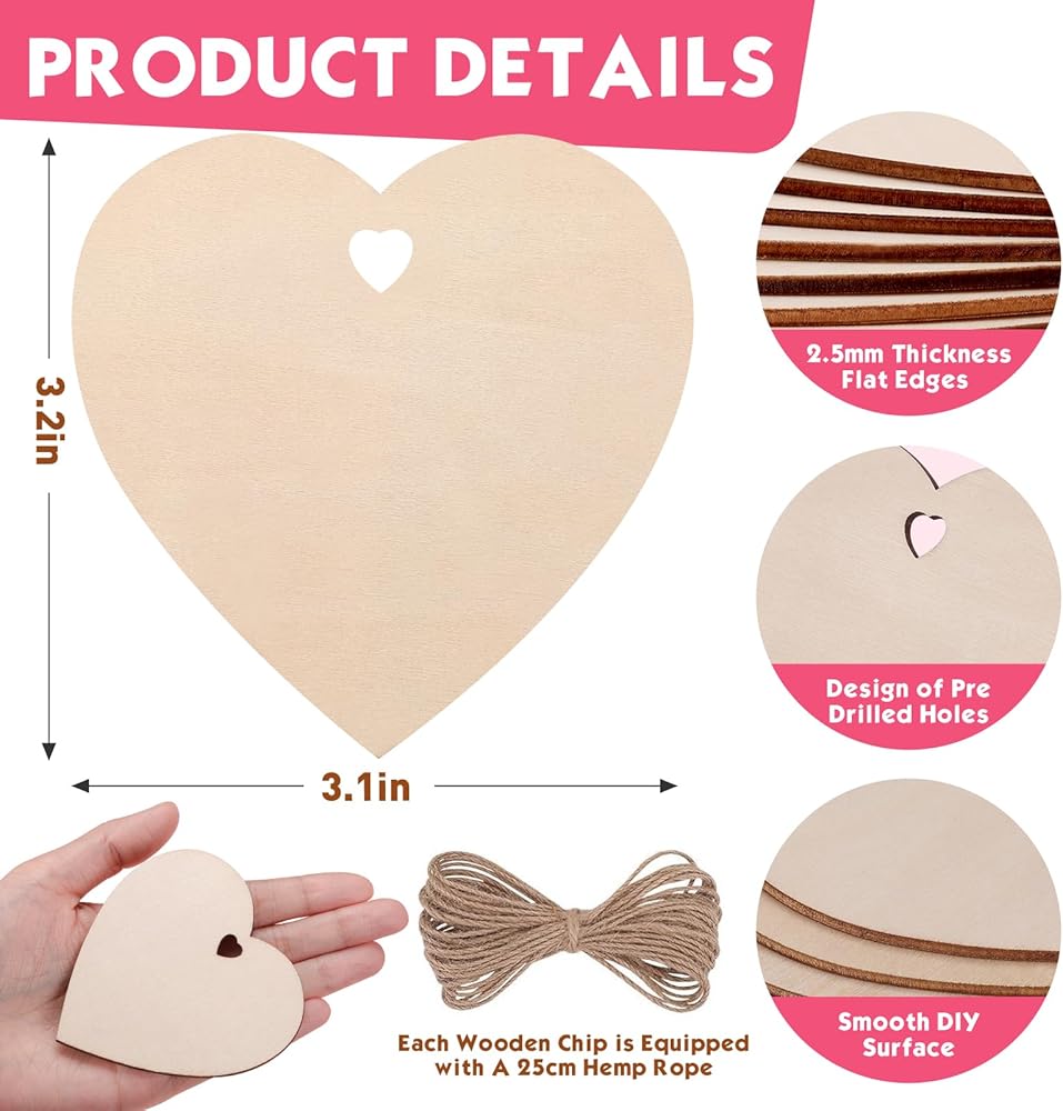 سوف تحصل على 60 قطعة زينة على شكل قلوب خشبية، كل قطعة من خشب القلب الفارغ غير المكتمل القابل للطلاء يبلغ مقاسها 3.15 × 3.2 بوصة ومجهزة بحبل بطول 25 سم. كمية كافية لك لتزيين منزلك بما يرضي قلبك خلال عيد الحب وعيد الميلاد.