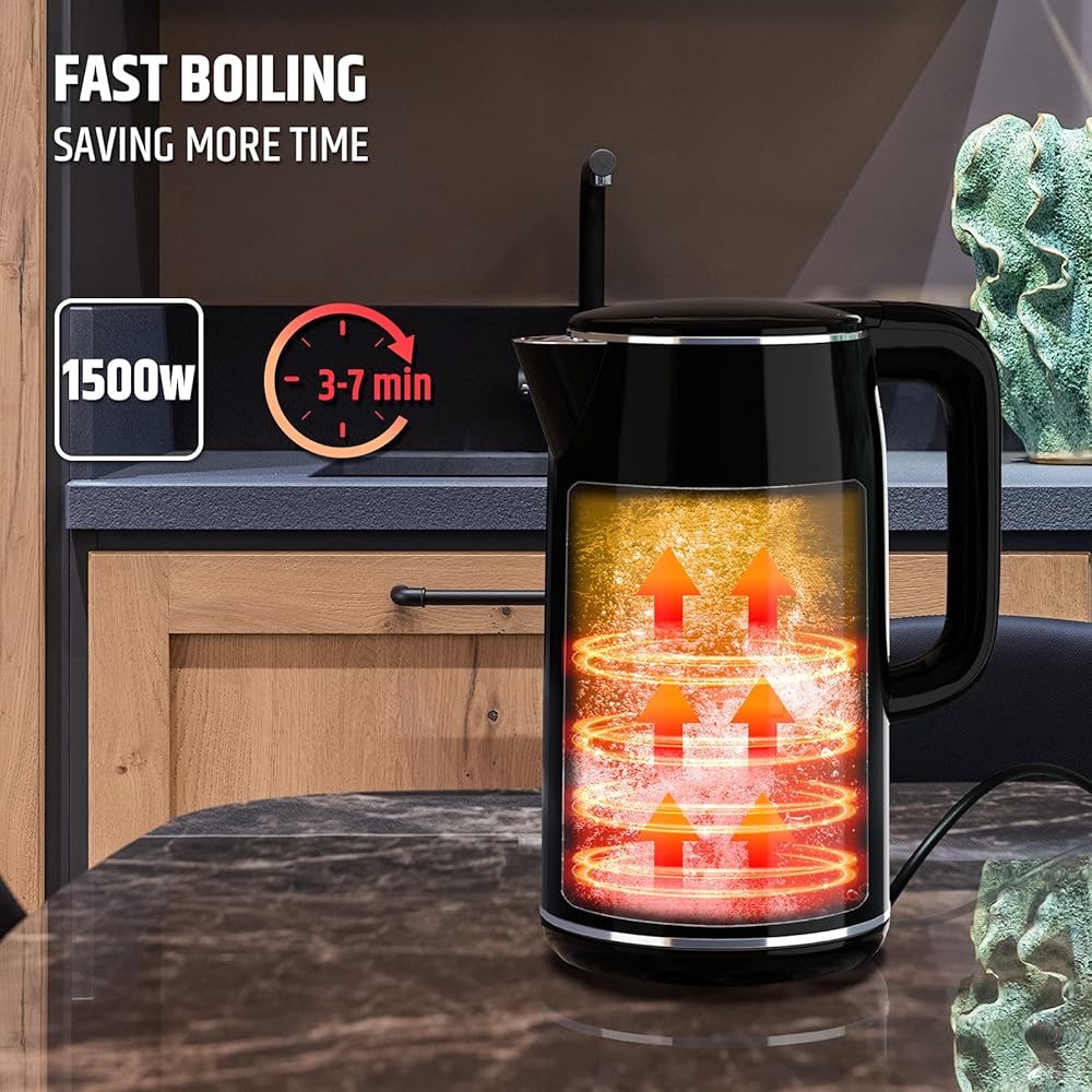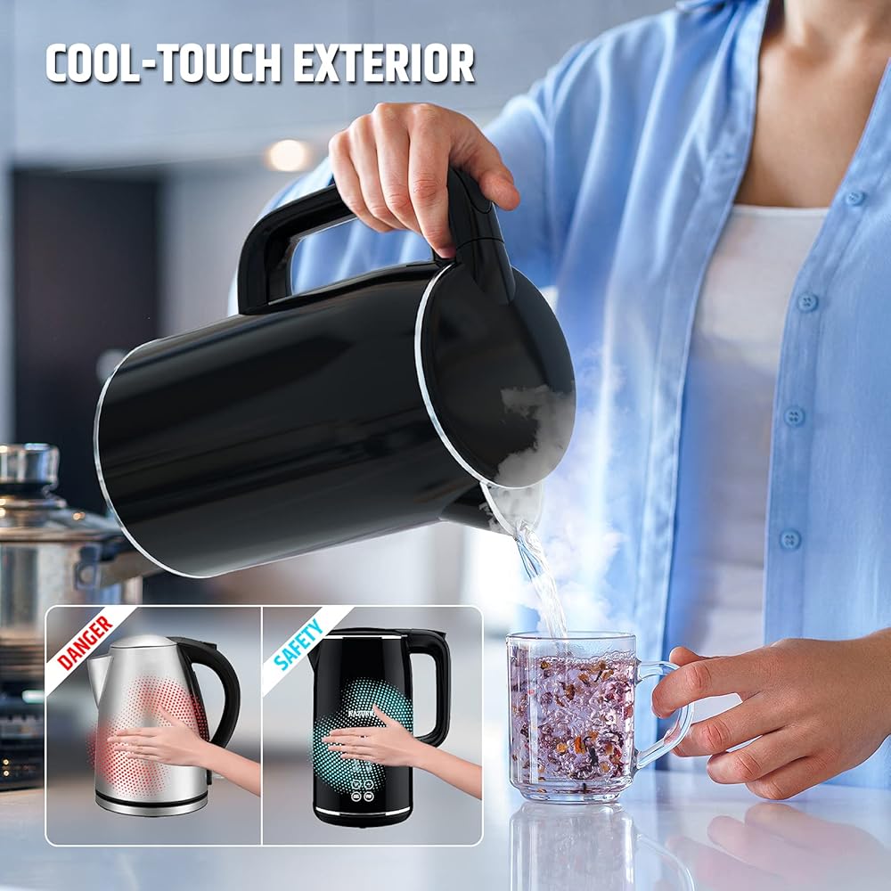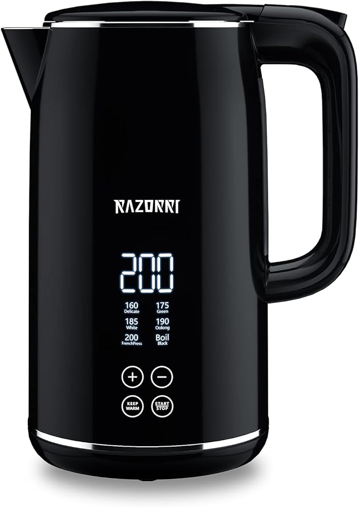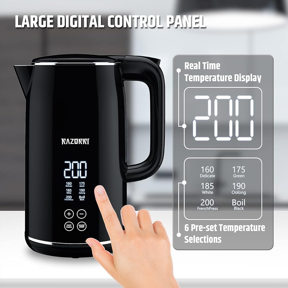 غلاية كهربائية رازوري، شاشة رقمية LED للتحكم بنقرة واحدة، 1.7 لتر خالية من مادة BPA، جدار مزدوج معزول من الفولاذ المقاوم للصدأ، حماية من الغليان الجاف، تحافظ على الدفء للشاي والقهوة، باردة الملمس، لاسلكية، أسود