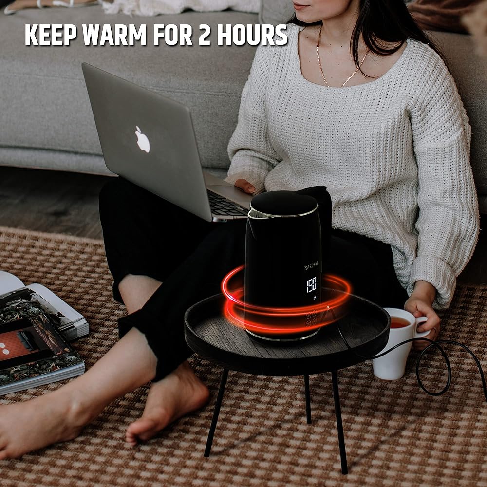 • ☕حافظ على دفء الماء: ستحافظ غلايتك على درجة الحرارة لمدة تصل إلى ساعتين إذا قمت بتنشيط وظيفة الحفاظ على الدفء. بعد ساعتين من عدم الاستخدام، سيتم إيقاف تشغيل الغلاية تلقائيًا وتعود إلى درجة حرارة الغرفة.
