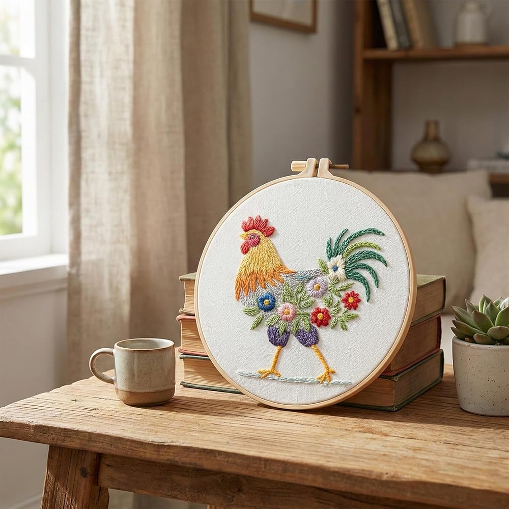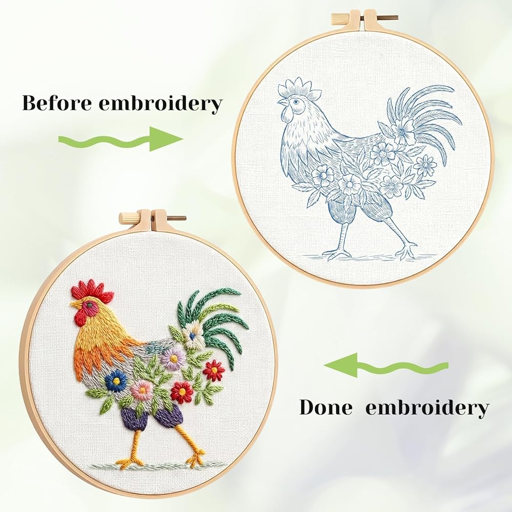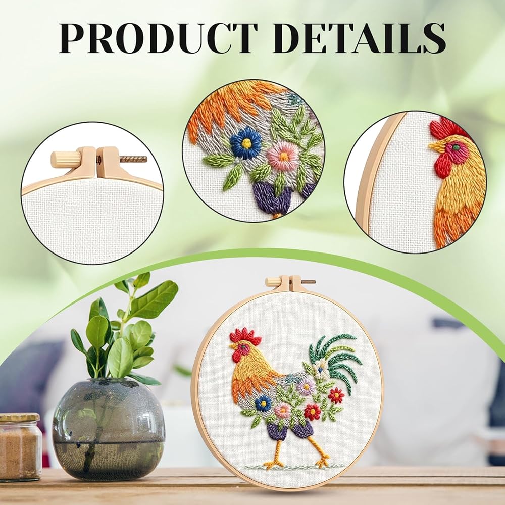 Detailed Rooster Embroidery: Embroidery kit for beginners features a distinctive farm-themed rooster pattern with clear stitching guides; High-quality threads provided in various colors for vibrant results; Durable embroidery hoop maintains fabric tension during work