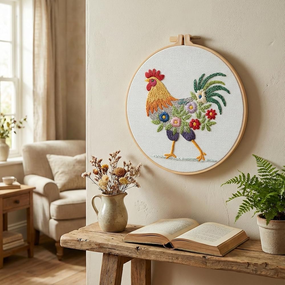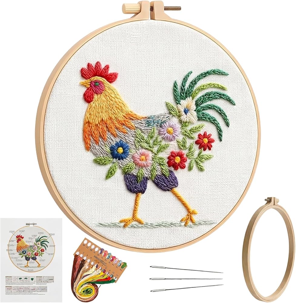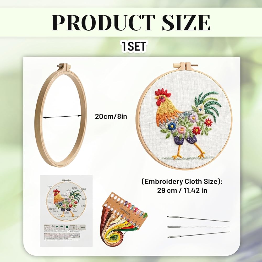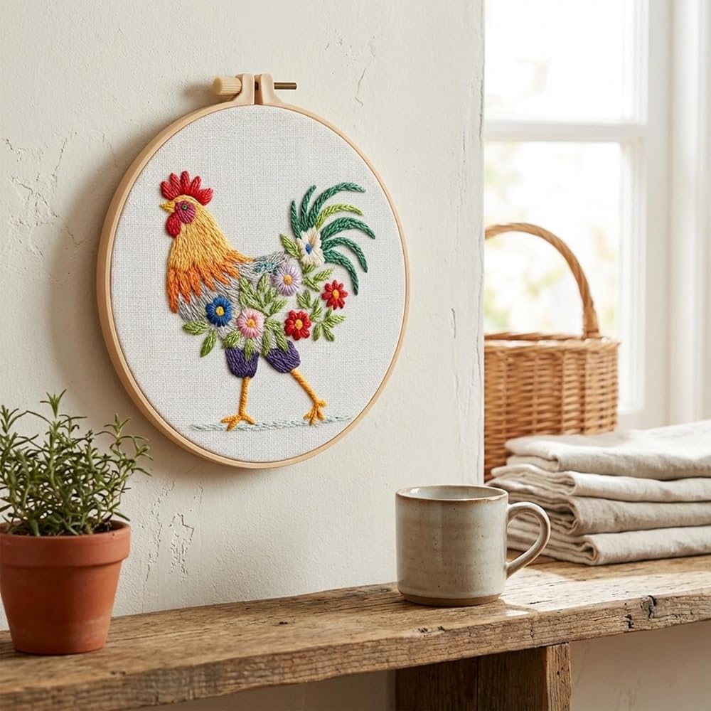 Detailed Rooster Embroidery: Embroidery kit for beginners features a distinctive farm-themed rooster pattern with clear stitching guides; High-quality threads provided in various colors for vibrant results; Durable embroidery hoop maintains fabric tension during work