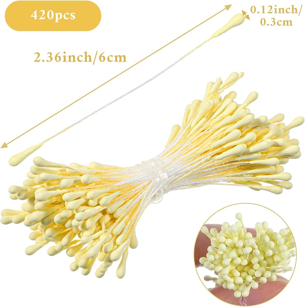 【Package Includes】You will receive 420 double heads flower stamens, each measuring 2.36 inches (6 cm) long and 0.12 inches (3 mm) wide.The ample quantity and compact size make them suitable for making headpieces, corsages, or decorative journals