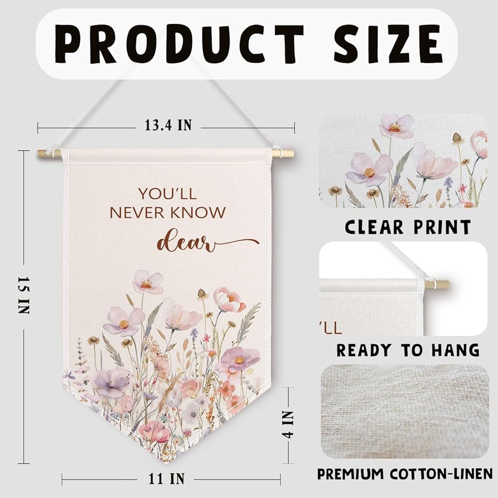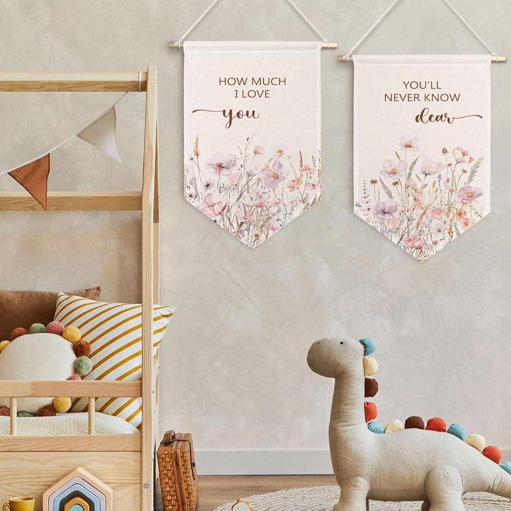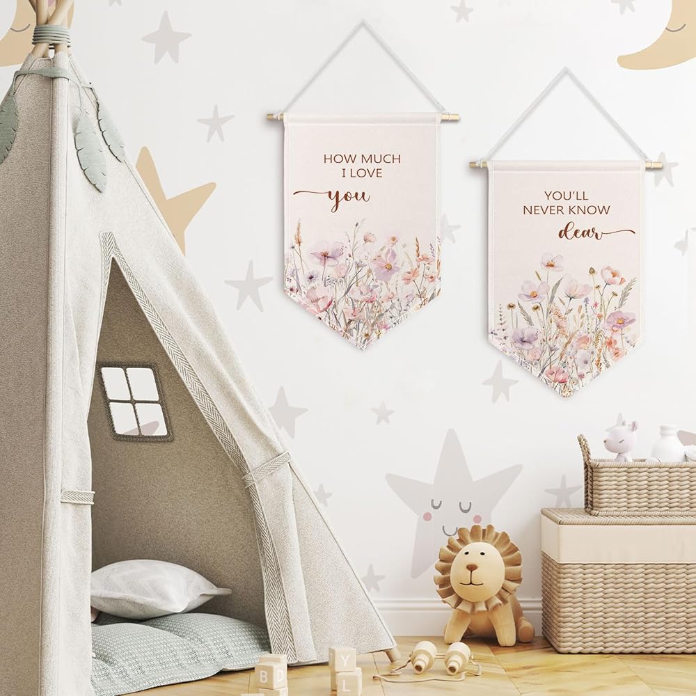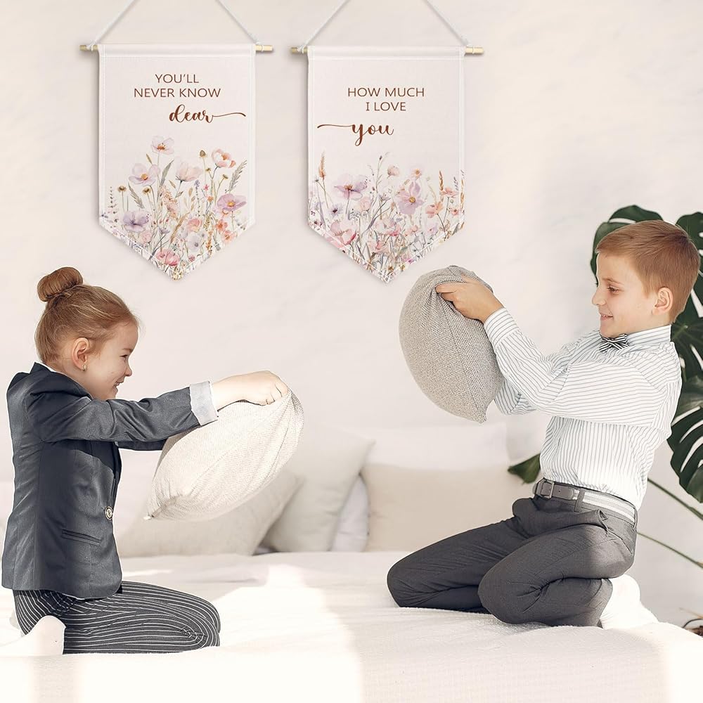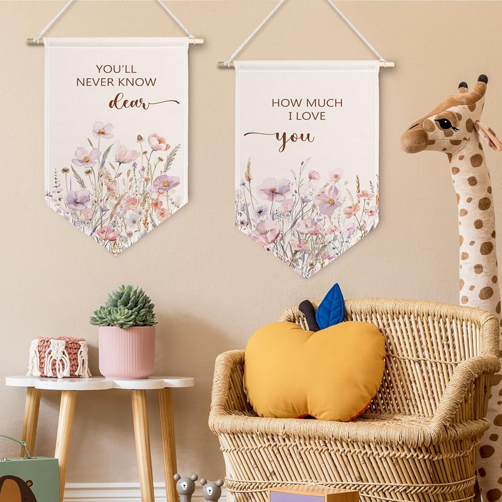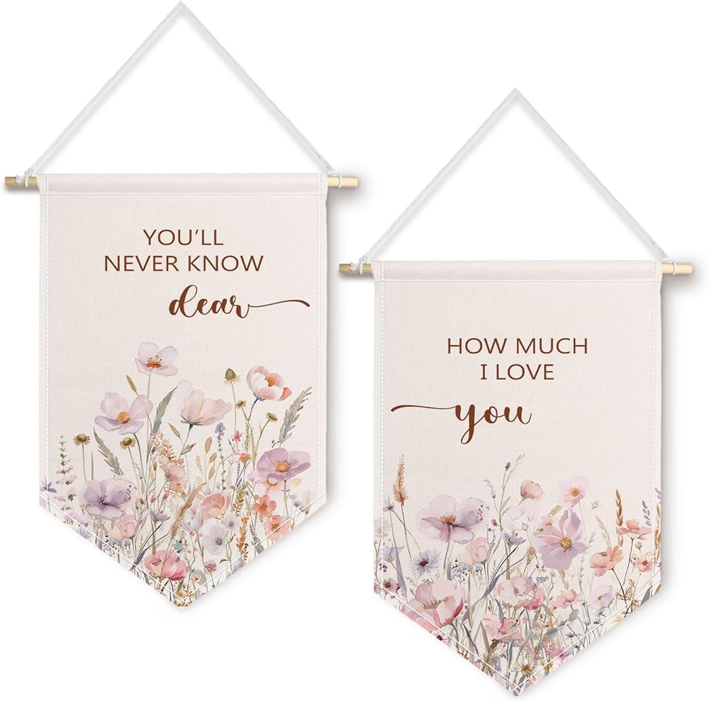 مجموعة لافتة قماشية لحضانة ChissNook Wildflower مكونة من 2، لن تعرف أبدًا عزيزي كم أحبك، لافتة راية معلقة على الحائط، ديكور جدار الحضانة للأطفال البنات، غرفة النوم، غرفة اللعب