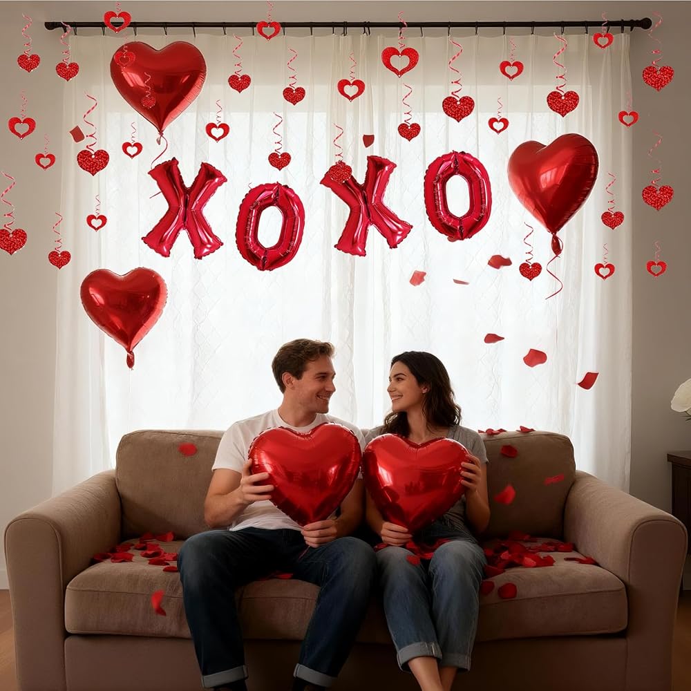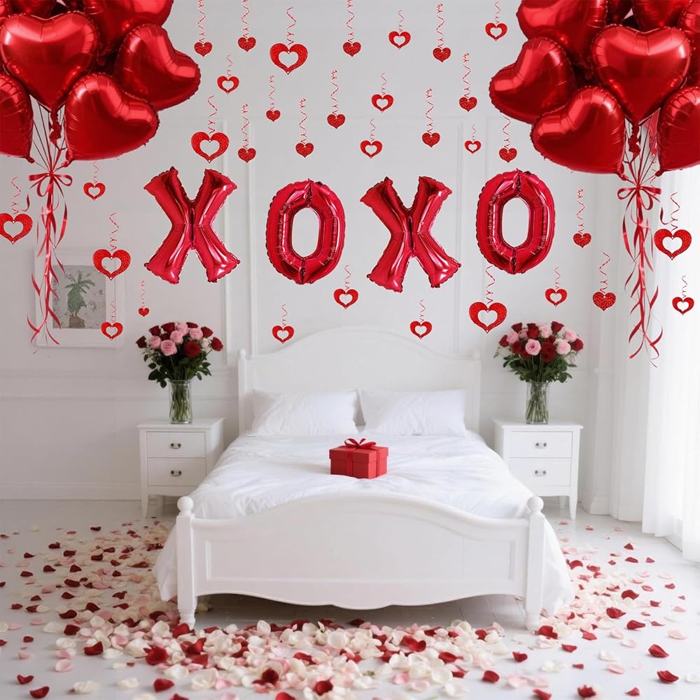 Valentines Day decorations: Package includes 8 pieces of 18 inch red heart balloons, 4 pieces of 16 inch red foil XOXO balloons and 50 Pcs red heart hanging decor. Meet your romantic decor needs and start a special Valentines Day party