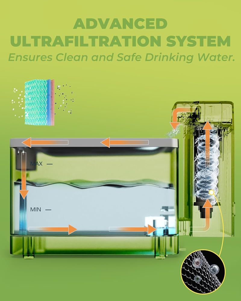 نظام الترشيح الفائق الحقيقي: يضمن مياه الشرب النظيفة الحقيقية عن طريق تصفية الشوائب والجسيمات والروائح التي تزيد عن 0.01 ميكرون، مما يعزز صحة حيوانك الأليف. (نصيحة: قم بتغيير استبدال مرشح UF، اضغط مع الاستمرار على الزر لمدة 5 ثوانٍ لإعادة ضبط الضوء الأحمر إلى اللون الأخضر، والتأكد من أن الفلتر يعمل)