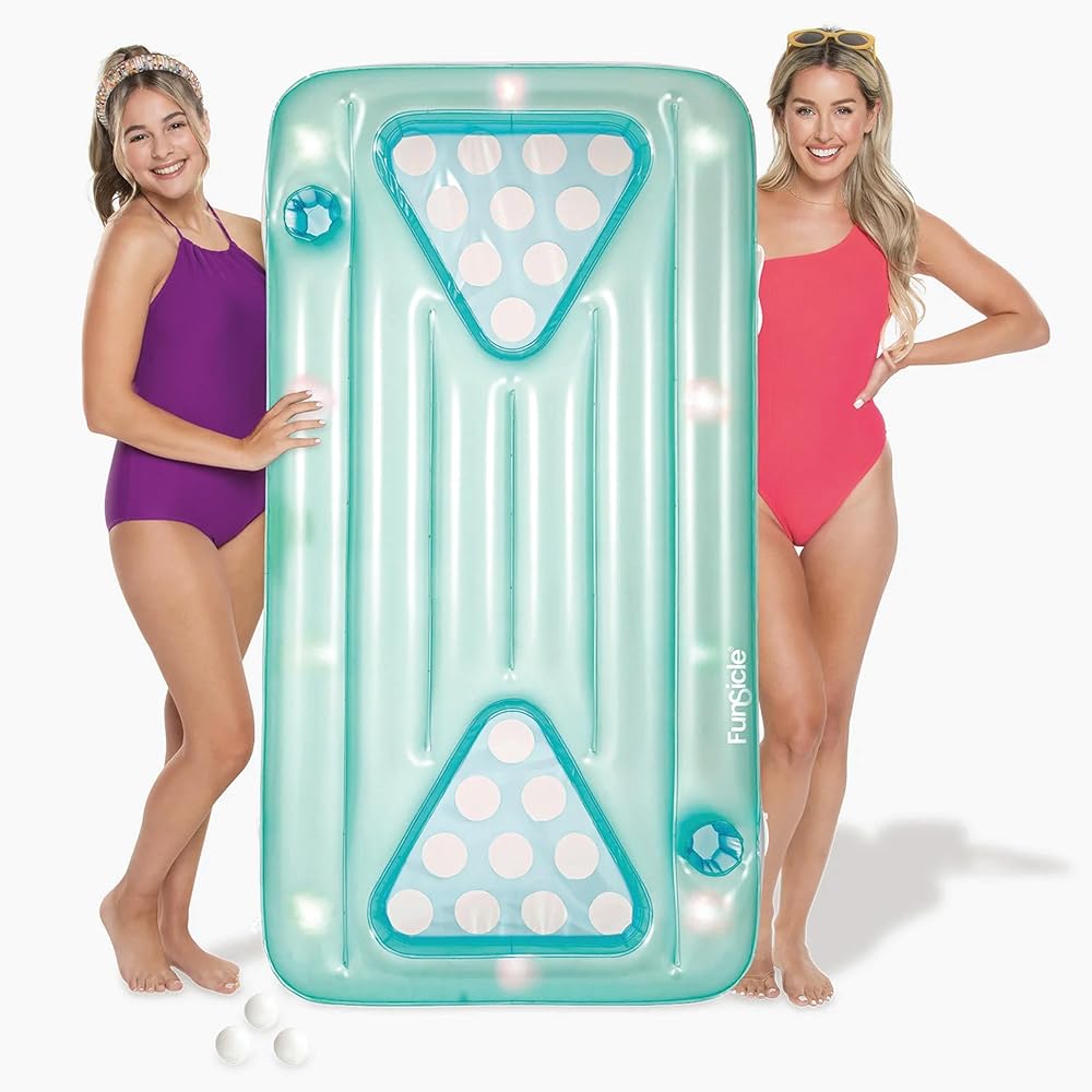 Toss the glow-winning shot with the Maccabi Art Glow Pong – an inflatable aqua pong game that brings the ultimate entertainment to your pool gatherings. Designed with two triangle grids for cup placement, it's perfect for friendly pong competitions in the water. What truly sets it apart is the integrated color-changing LED light system, powered by a battery-operated timer with an on/off switch, making it ideal for both daytime play and nighttime vibes. Whether it's a pool party, beach hangout, or lake getaway, this float turns any setting into a glowing arena of fun.