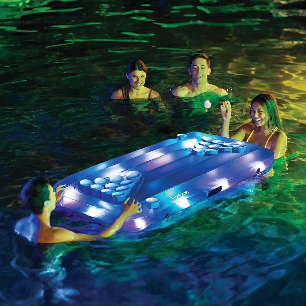 Crafted from durable PVC and electronic components including ABS and iron, it ensures long-lasting performance. The Easy Grip valve allows quick inflation and deflation, while the DuraSeam technology reinforces the seams to resist leaks. Two built-in drink holders let you keep your refreshments close as you float and play. Lightweight at just 4 lbs and measuring 63" x 33" x 7.5", it's easy to carry, store, and deploy when fun calls. Whether you're relaxing or showing off your pong skills, the Glow Pong is your go-to float for unforgettable summer moments.