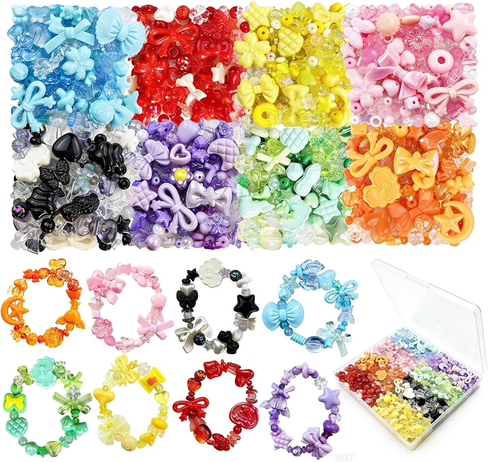 600-650 قطعة من الخرز الأكريليك لصنع الأساور، 8 ألوان مختلطة لطيف على شكل زهرة وفيونكة على شكل فراشة ودب وأساور وقلادات وسلاسل مفاتيح مصنوعة يدويًا