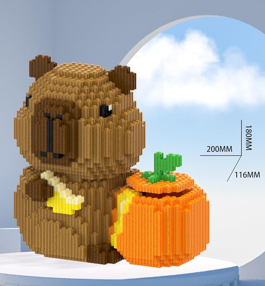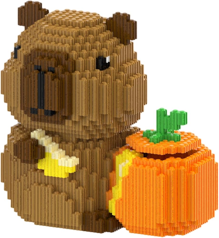 - تصميم مبتكر: كابيبارا الرائعة بتصميم اليقطين مصنوعة من مكعبات بناء صغيرة، مثالية للبناء والعرض التفصيلي.