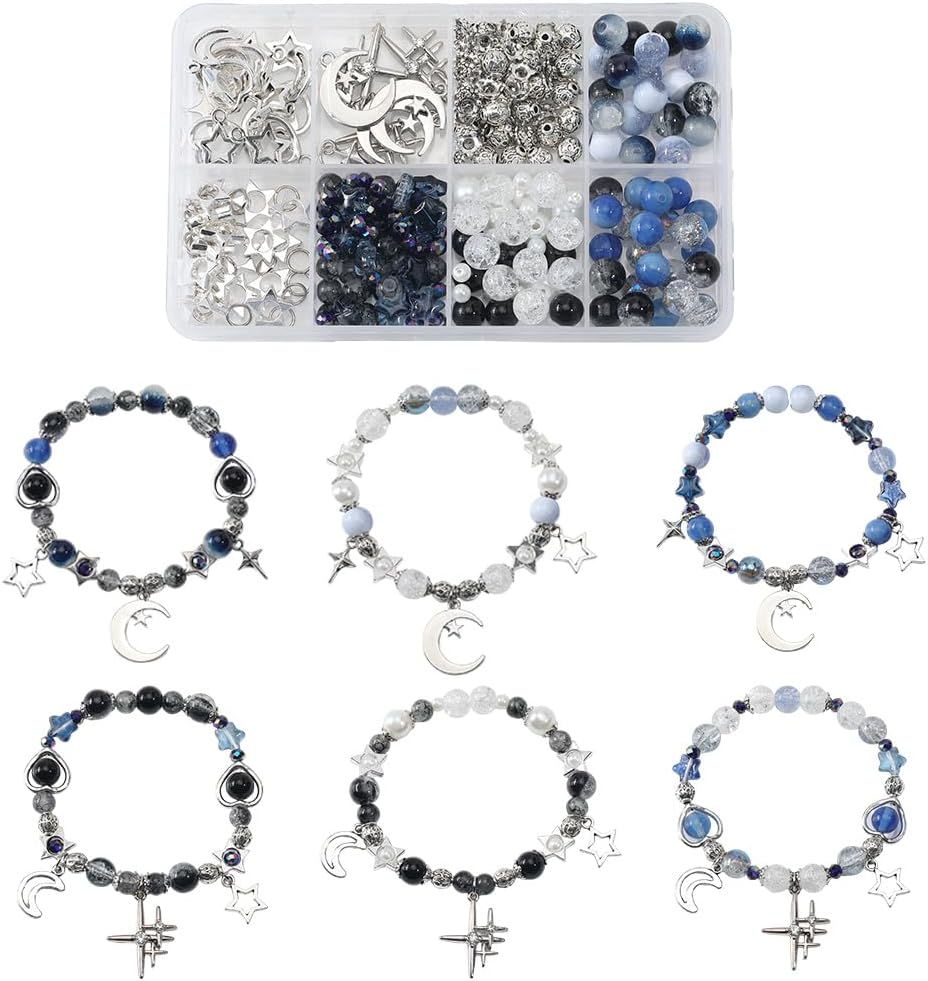 SUNNYCLUE 1 Box 314Pcs DIY 6 Sets Bracelets Making Kit Moon and Star Charms Crescent Stars Bead Blue Faceted Glass Imitation Pearl Loose Spacer Beads for Jewelry Making Kits Adult Women Gifts