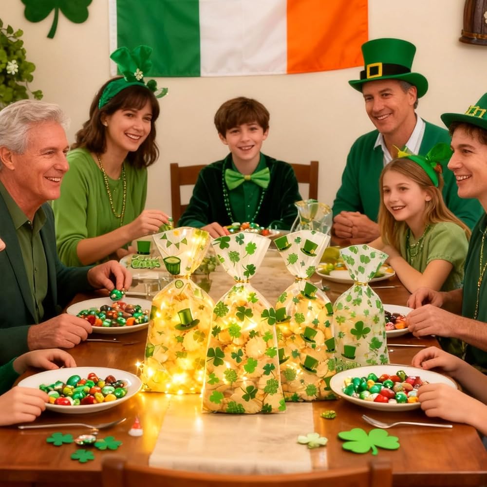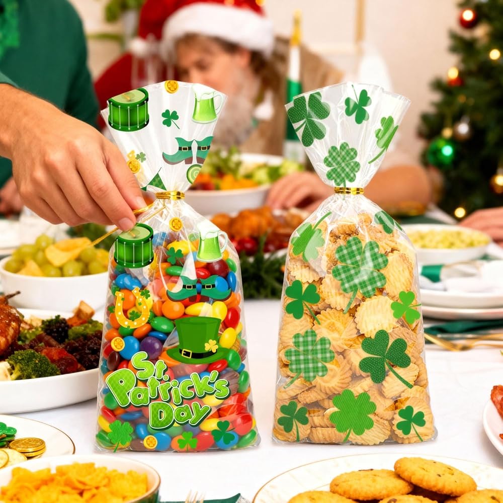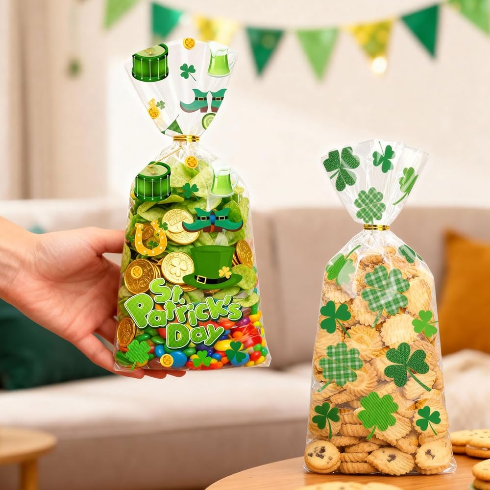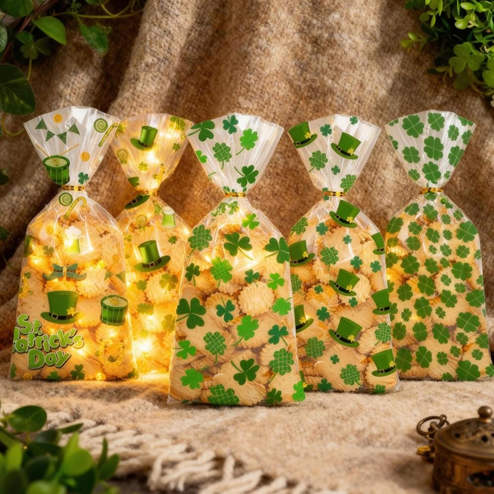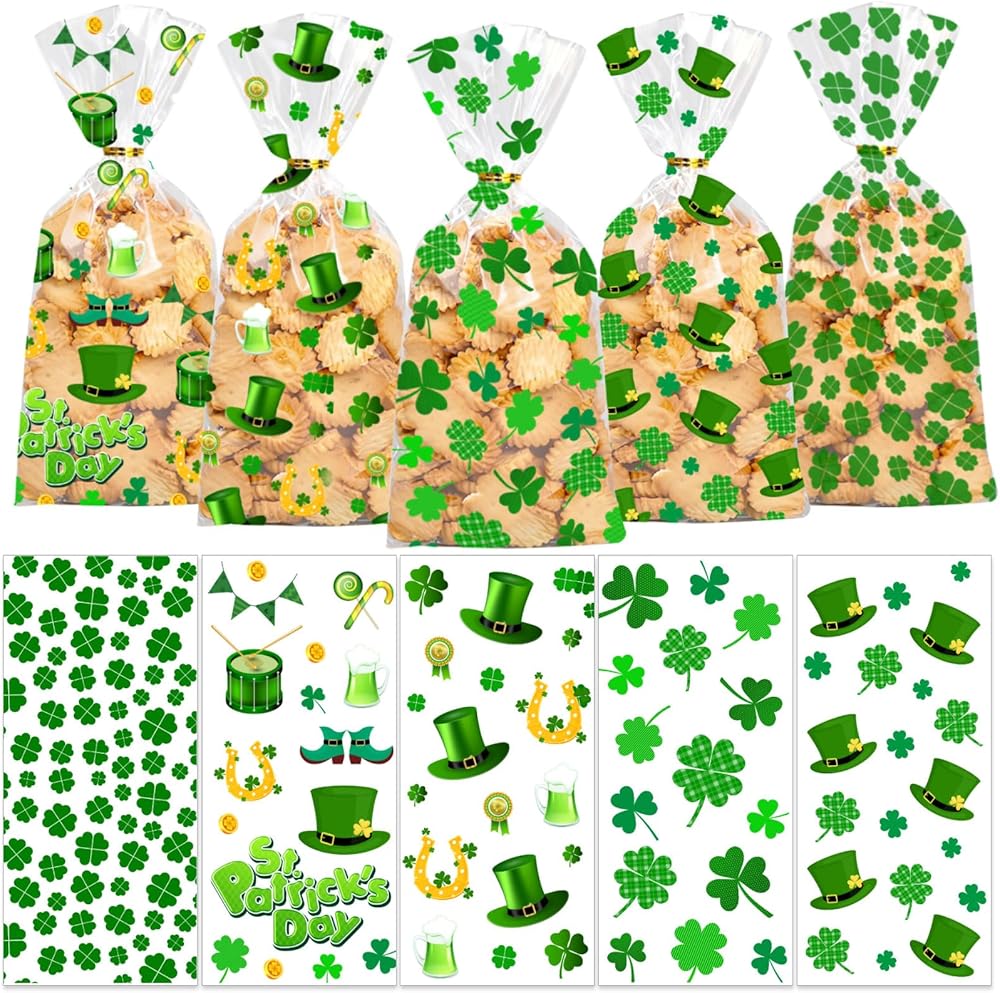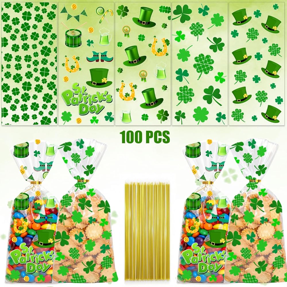 • 🍀 Green Cellophane Treat Bags. 100PCS Saint Patricks Day party favor bags with twist tie. 5 styles, each with 20 candy bags. Ample quantity to meet your diverse daily needs, perfect for St. Patrick's Day parties and gift wrapping.