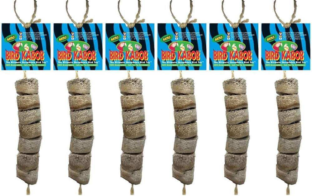 The Bird Kabob Mini is a shreddable hanging bird toy with yucca chunks. Hang it up in your bird's cage for hours of fun! If you haven't discovered the Bird Kabob, you've missed an amazing product that's popular around the world! This shredding toy is made from the Yucca plant, a balsa-like material, that is safe and loved by big and small birds alike. Birds just can't resist the all natural material. The texture is harder than palm and paper and softer than wood. Your bird will have shredding pleasure times 3X! Bird Kabobs are the ultimate shreddable bird toys. Made from a soft pithy wood. They are irresistible to all hookbill birds from parakeets to macaws. They satisfy the instinctual need of these birds to chew. They have been described as "Catnip for Birds". Recommended by veterinarians for birds with feather picking problems. Legendary among bird lovers worldwide. You'll be amazed at the site of your bird enjoying the Bird Kabob. These are truly the most sensational bird toys ever made. All Bird Kabob products are heat treated in a kiln and are 100% naturally grown and handmade. Natural color variations range from dark gray to beige. Product does not expire.