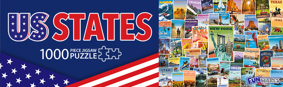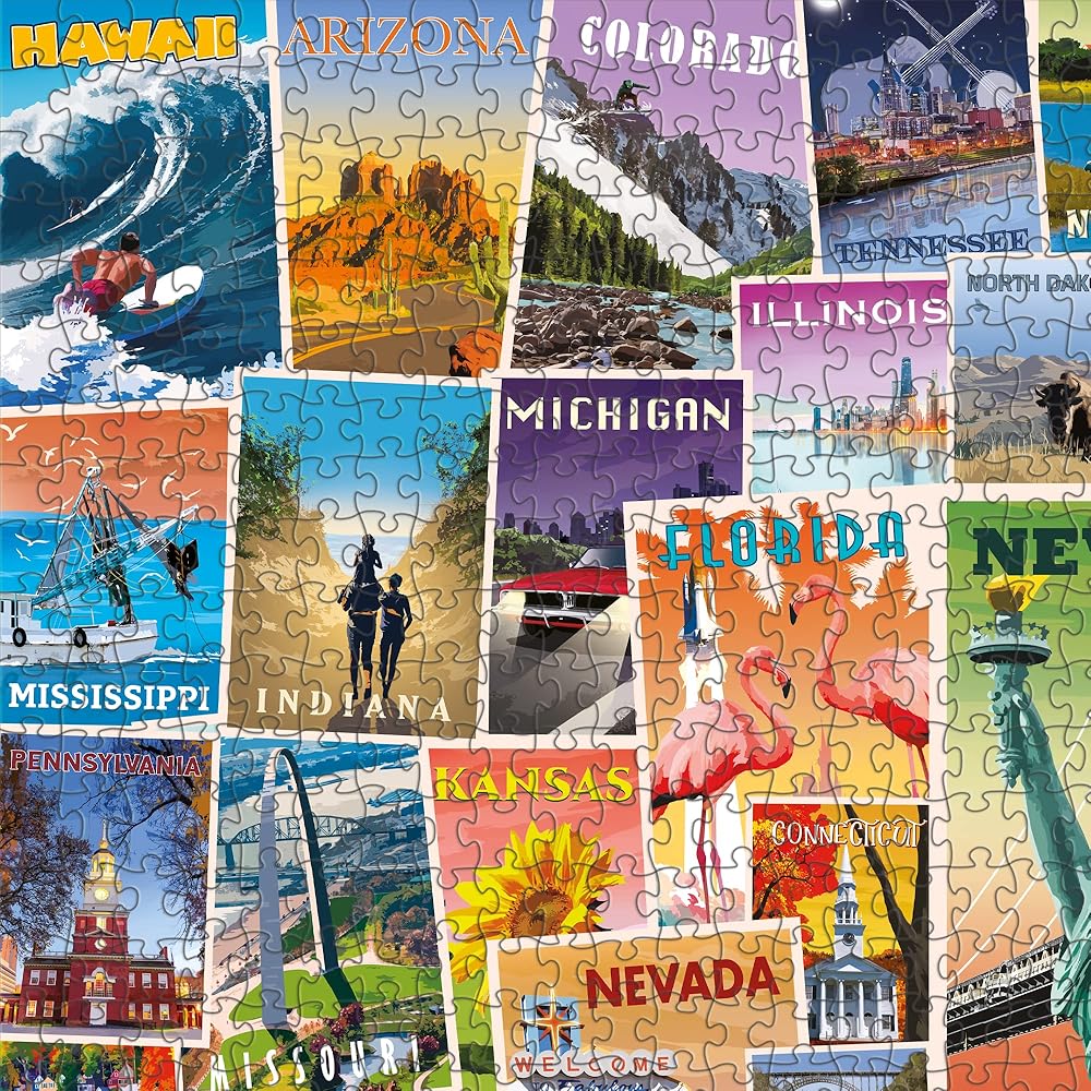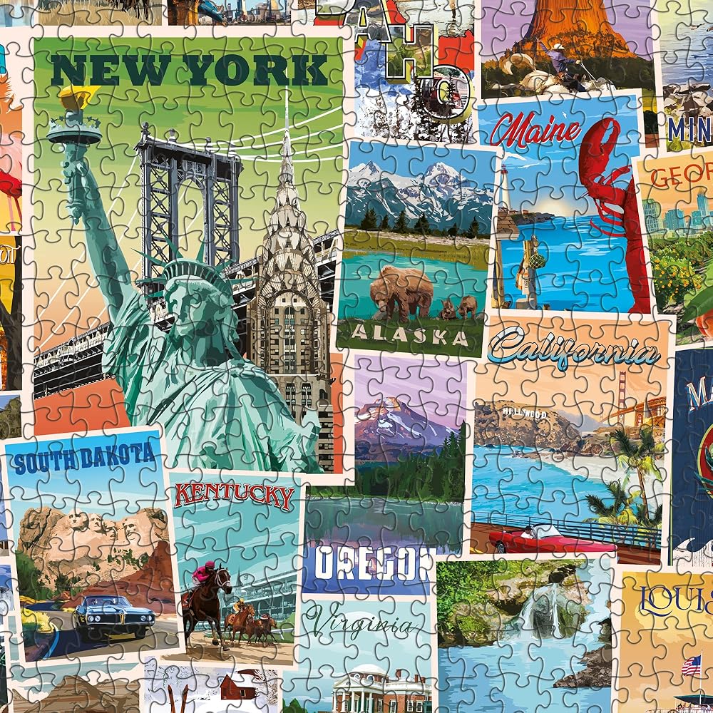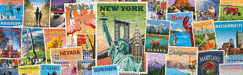 استمتع بتجربة المغامرة: من ألاباما إلى وايومنغ، تم تمثيل جميع الولايات الخمسين في هذا اللغز المجمع الجميل. تصور الملصقات ذات الطراز العتيق الجمال والحيوانات البرية والتاريخ والعجائب الطبيعية التي ستواجهها في أحجية الولايات المتحدة الخاصة بنا.