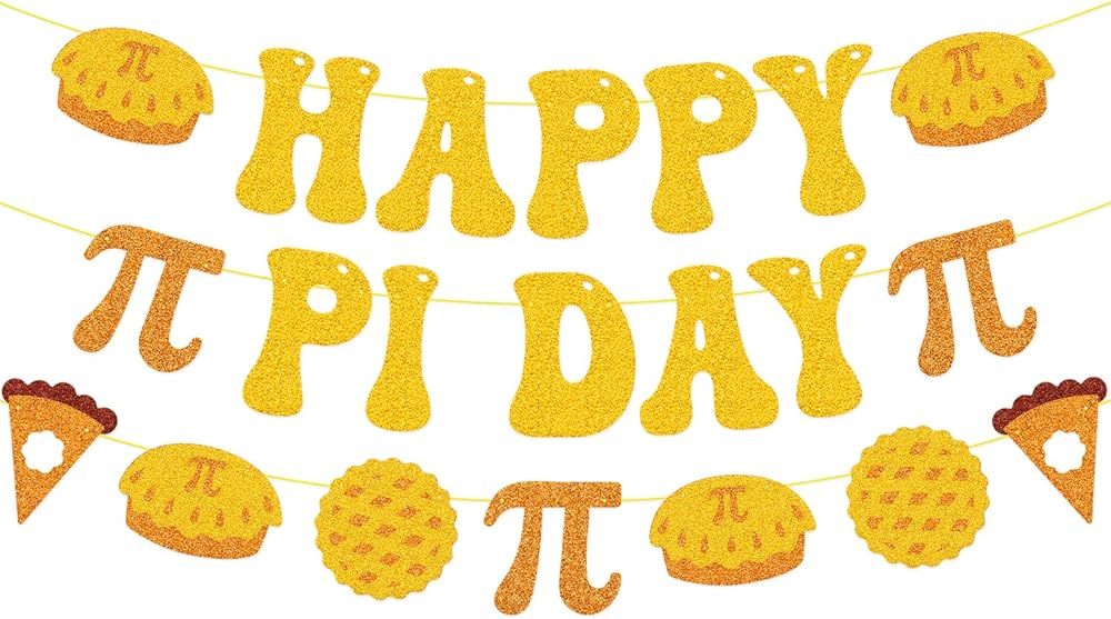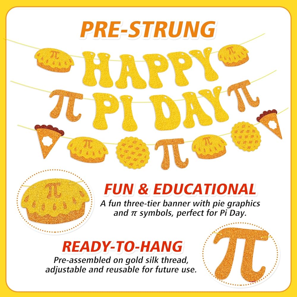 Celebrate Pi Day with a Slice of Fun! Make your Pi Day celebrations unforgettable with our Happy Pi Day Glitter Banner! Whether you're a math enthusiast, a teacher, or a party host, this beautifully crafted banner brings a touch of sparkle and playfulness to your 3.14 festivities. Designed with a unique three-tier layout, the banner features delightful pie graphics and the iconic pi symbol, perfectly merging the world of math with delicious treats. The charming bubbly font, vibrant gold and orange color scheme, and high-quality glitter finish make this banner the ultimate Pi Day decor. Pre-strung on gold silk thread, it's easy to hang, and the adjustable spacing allows you to customize it to fit any space perfectly. No more fussing with assembly - simply unbox and hang to instantly elevate your party, classroom, or office!