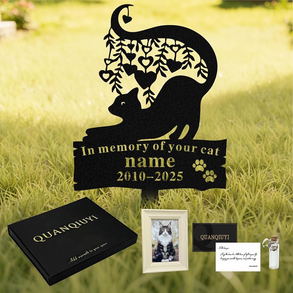 - علامة قبر معدنية مخصصة منقوش عليها اسم قطتك وسنواتها. الفولاذ المقاوم للطقس يقف بقوة في أي مكان خارجي.