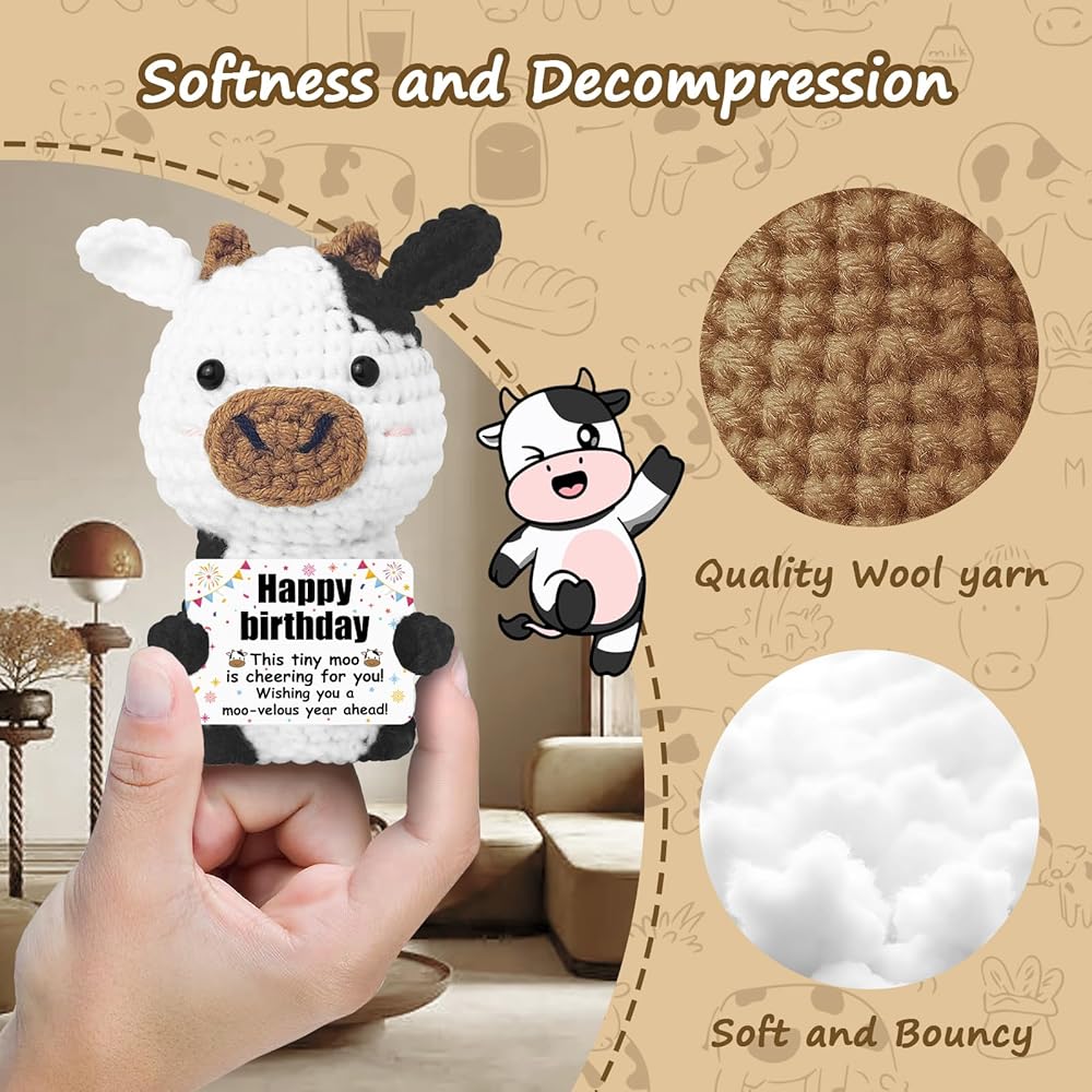 Mini Cute Positive Cow: With its adorable handmade look and snuggly feel, this corchet doll cow brightens up any corner. Place it on your desk, shelf, or windowsill for a pop of playful joy