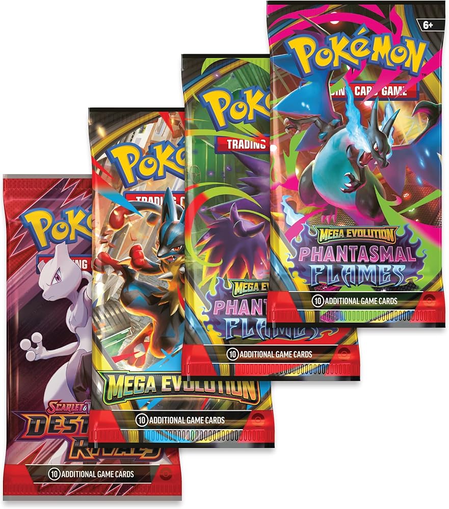 Choose Your Charizard! Under the right conditions—including a strong bond with its Trainer—Charizard can surpass its own limits and Mega Evolve! With this tin, you can choose the raging blue flames of Mega Charizard X ex or the aerial agility of Mega Charizard Y ex, then find more Pokémon inside a handful of booster packs.