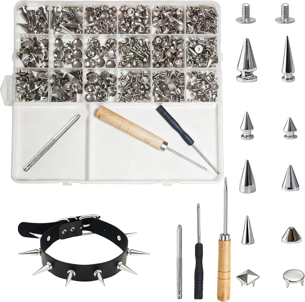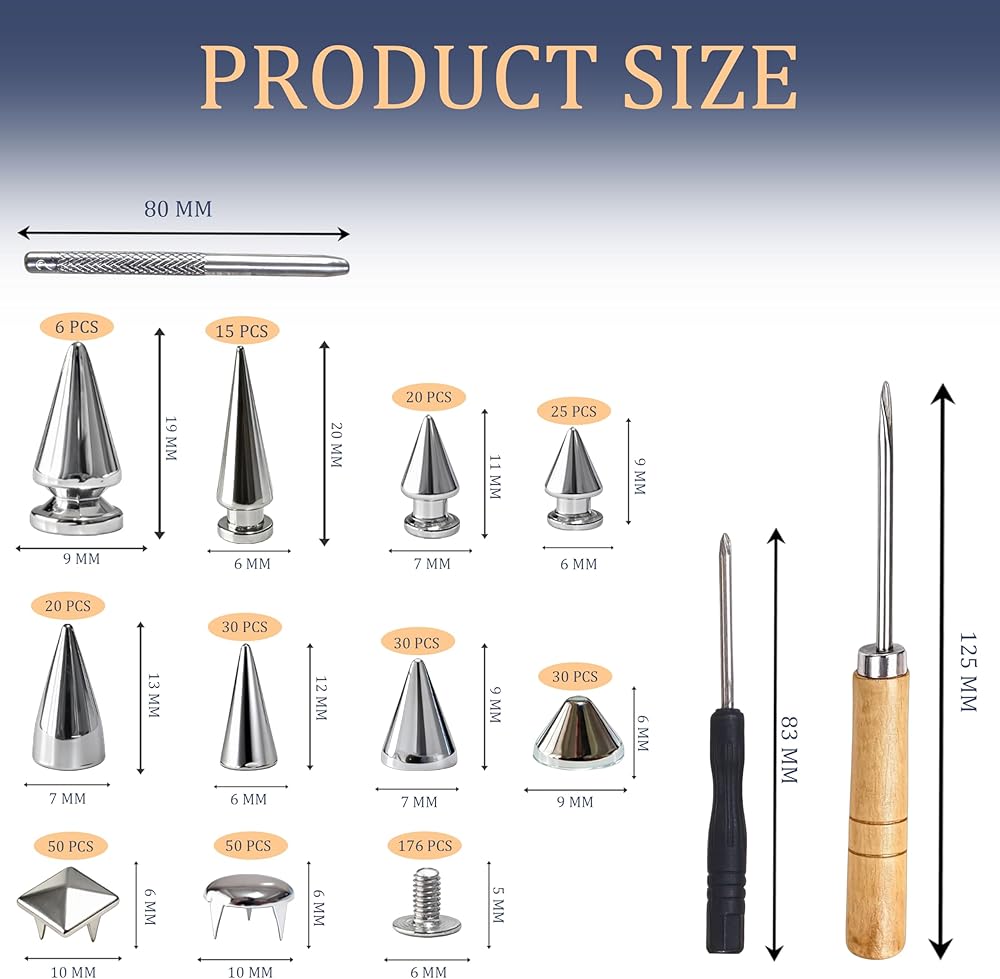 مجموعة المسامير والمسامير: تتضمن العبوة 176 قطعة من المسامير المخروطية في 8 مقاسات، و176 قطعة من البراغي، و50 قطعة من المسامير الهرمية المربعة، و50 قطعة من المسامير المقببة المستديرة، ومثقاب، ومخرمة، ومفك براغي، وصندوق تخزين. مجموعة كاملة من الأزرار والأدوات للمشروعات اليدوية السهلة