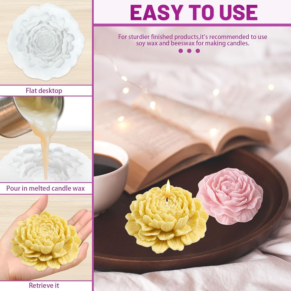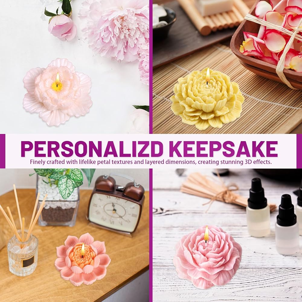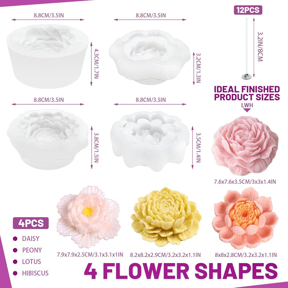 This flower candle mold set features four classic floral patterns: the luxurious peony, fresh and charming daisy, elegant layered hibiscus, and serene lotus, catering to diverse occasions. Perfect for crafting candles, soaps, or dessert decorations, it effortlessly adds a touch of romance.
