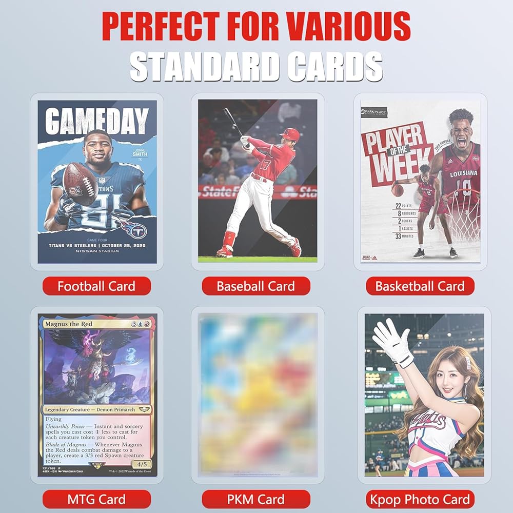 ✅[استخدام وتوافق متعدد الاستخدامات] تناسب أغلفة البطاقات العلوية أنواعًا مختلفة من البطاقات، بما في ذلك بطاقات التداول، وبطاقات البيسبول، والبطاقات الرياضية، وبطاقة البوكيمون، وبطاقات MTG، وبطاقات Yugioh، وبطاقات صور Kpop، وغيرها الكثير. توفر هذه الأجهزة ذات التحميل العلوي قيمة ممتازة لأي جامع بطاقات. سواء كنت جامع بطاقات، أو لاعبًا، أو هاويًا، أو تاجرًا محترفًا، فإن أجهزة التحميل العلوية لدينا هي الخيار الأمثل للحفاظ على الحالة الأصلية لبطاقاتك.