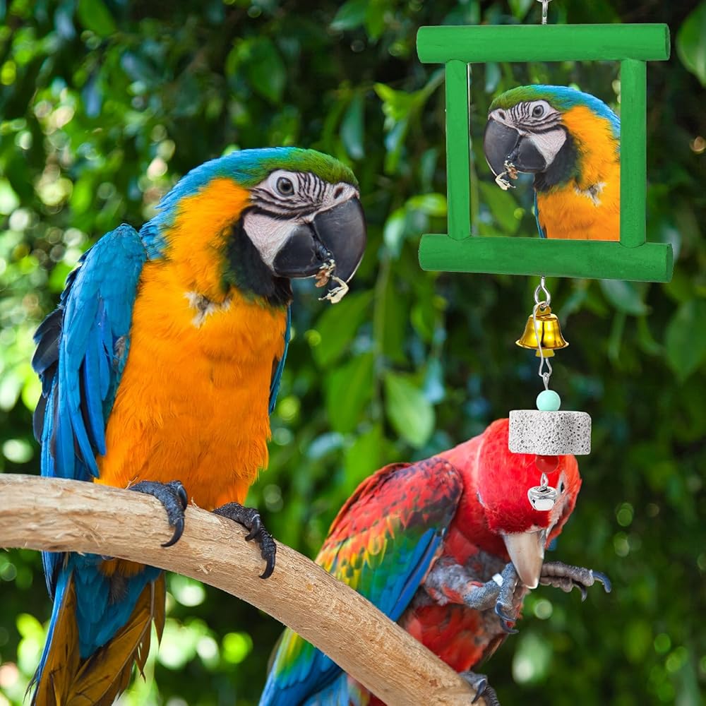 【Safe Quality Materials】 Constructed from non-toxic, bird-safe components, our toys prioritize your pet's well-being. The mirror frames and xylophone base are made of sturdy, natural wood, while the reflective surfaces use safe acrylic. The grinding stones are composed of porous mineral and calcium-rich stone, beneficial for beak health.