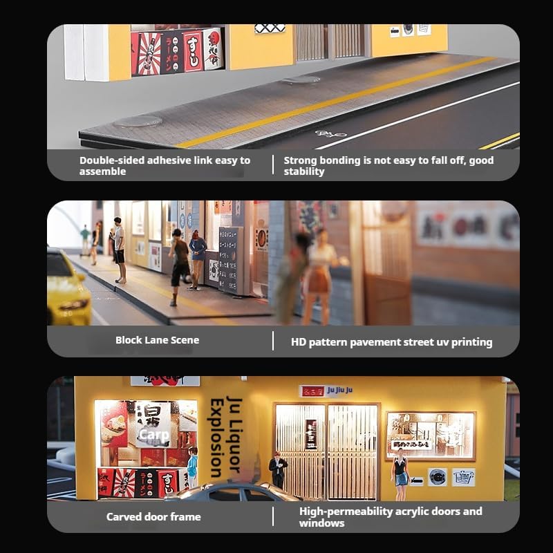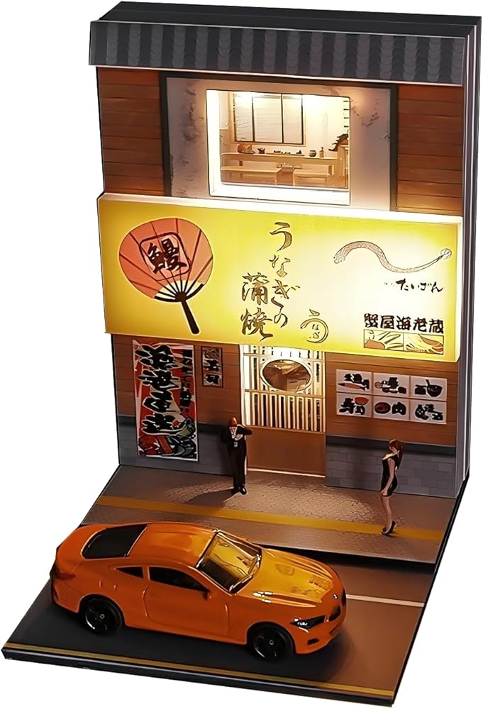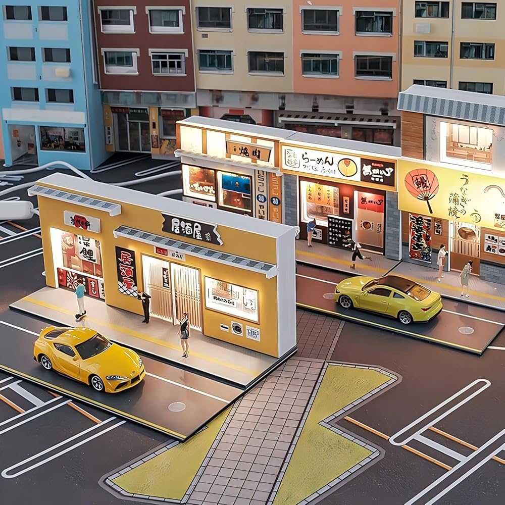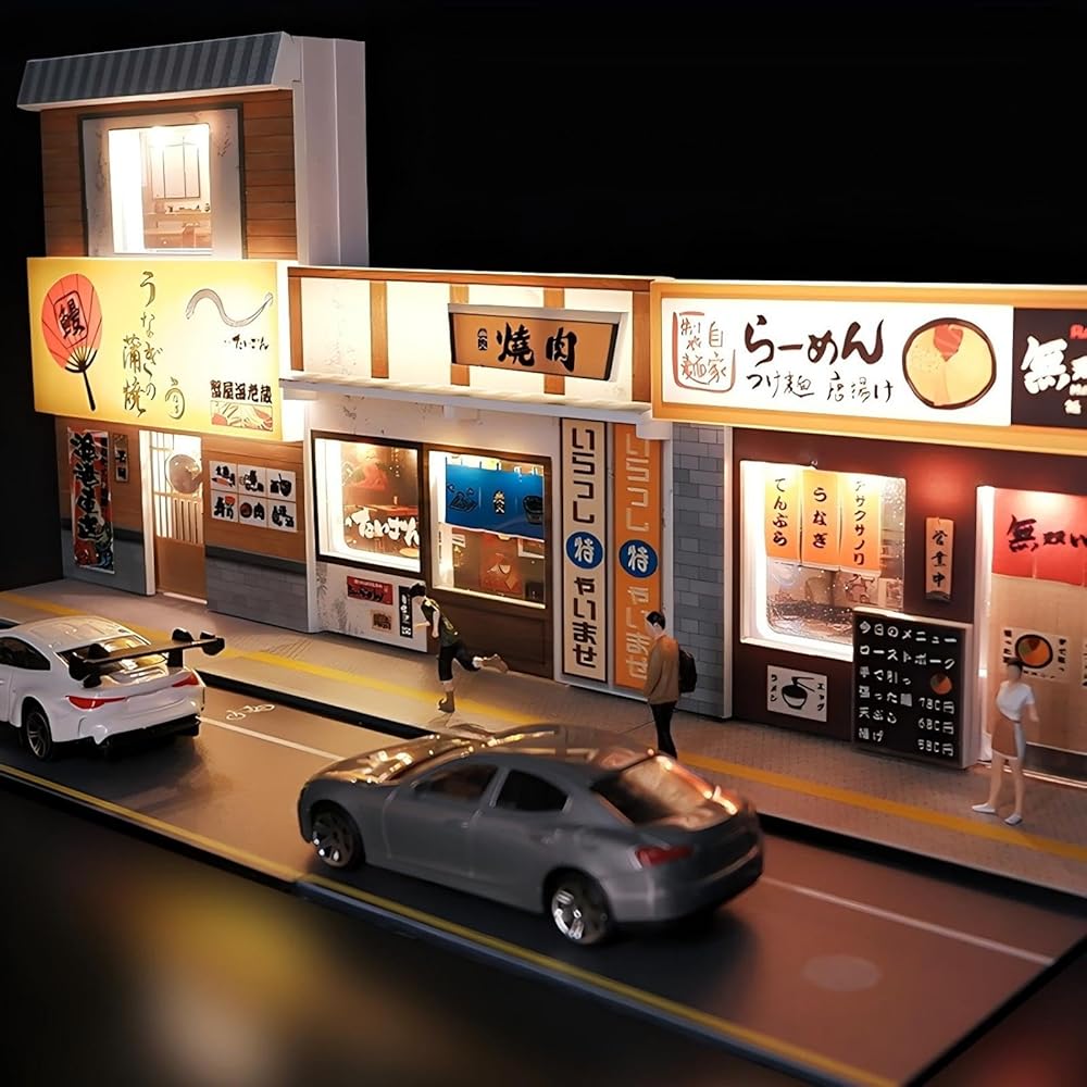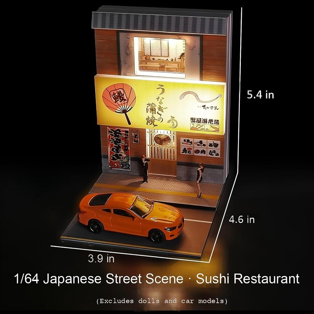 ديوراما مطعم سوشي بمستويين 1:64 مع أضواء LED - عرض مشهد شارع مصغر للسيارات المصبوبة والعجلات الساخنة