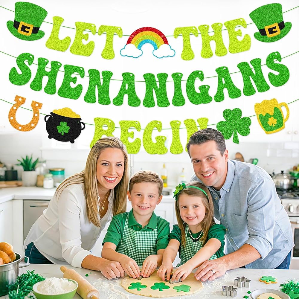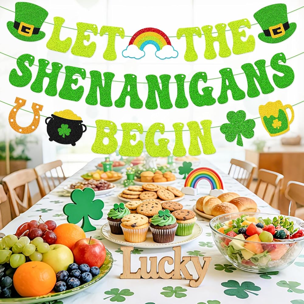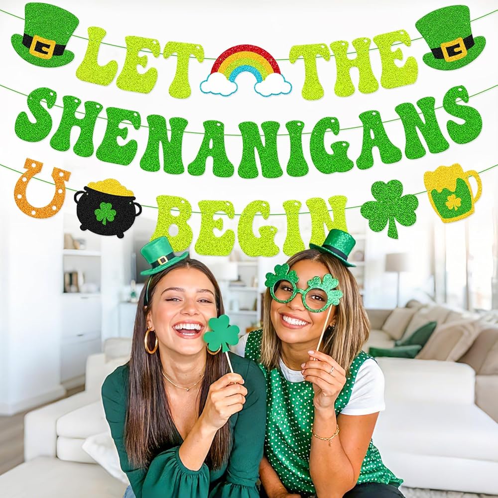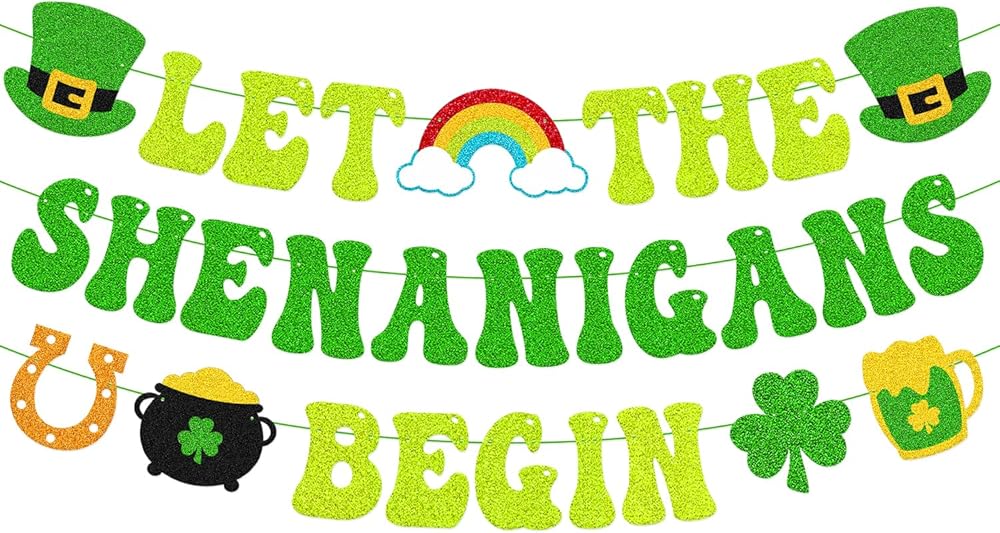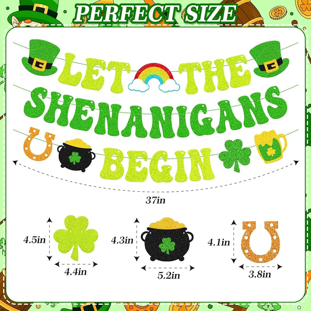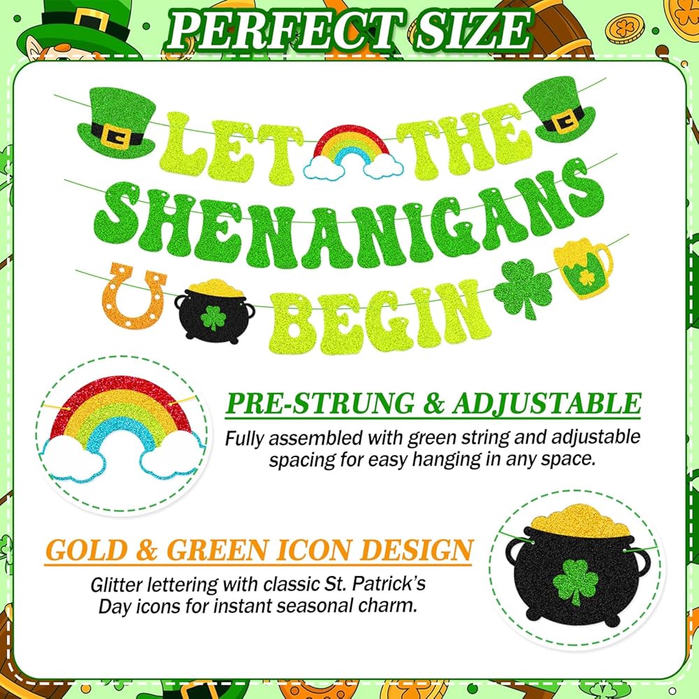 Bring a cheerful Irish touch to your St. Patrick's Day décor with this “Let The Shenanigans Begin” green glitter banner. Designed to reflect the playful spirit of the holiday, it's a simple yet eye-catching way to welcome guests and start the celebration. The banner features a mix of classic St. Patrick's Day symbols, including leprechaun hats, a rainbow with clouds, shamrocks, a pot of gold and horseshoes. Together, these elements create a lively decorative display that works well in both casual and festive settings. Made from green glitter cardstock and pre-strung with green string, this banner arrives ready to use. The adjustable spacing allows you to customize the layout to suit your space, whether you're decorating a fireplace mantel, office wall, party area, or setting up a themed photo backdrop. Suitable for St. Patrick's Day parties, Irish-themed events, classroom celebrations, office décor, or seasonal home decorating.