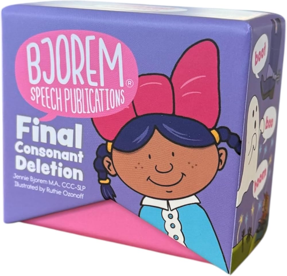 The Bjorem Final Consonant Deletion Therapy Deck is designed to help children who omit final sounds in words. This deck includes 25 minimal pair sets (36 total cards) that clearly contrast words with and without final consonants, making sound differences easy to see and hear. Featuring fun, engaging illustrations, this deck supports speech-language pathologists as they target final consonant deletion in a structured, evidence-based way. The clean visuals and minimal pair format encourage listening, awareness, and accurate production of final sounds during therapy sessions. Perfect for individual therapy, small groups, or home practice, this deck helps children build clearer speech by highlighting how final sounds change word meaning—an essential step toward improved intelligibility. Use this deck to: Target final consonant deletion using minimal pairs Increase awareness of missing final sounds Support articulation and phonological therapy Engage children with simple, kid-friendly visuals