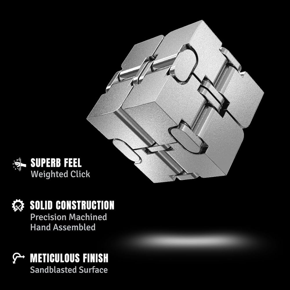 PRECISION ENGINEERING - Composed of eight small connected cubes, the infinity cube can be folded continually. It is made of premium, anodized aluminum alloy giving it a substantive, yet lightweight metal feel. There is a satisfying slight mechanical click as the infinity cube is folded over.