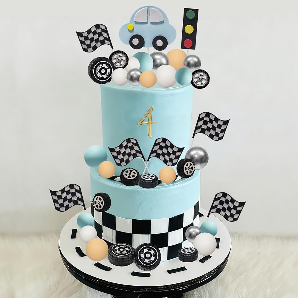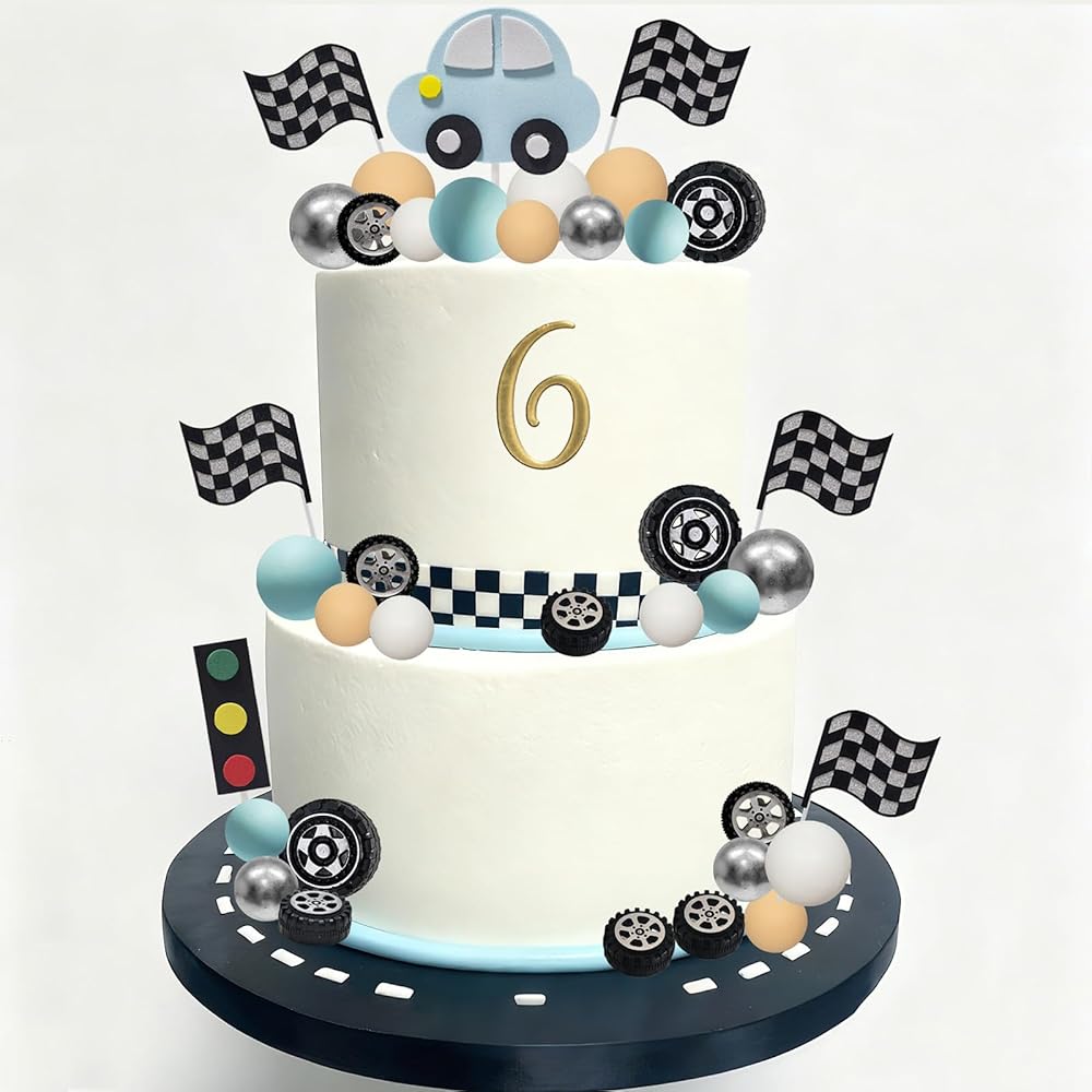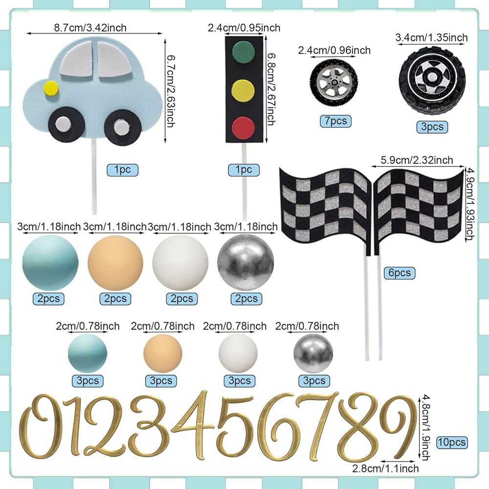 Safe Material: Car and traffic light are made of Eva. Checkered flag cake toppers are made of paper. 0-9 number cake toppers are made of acrylic. Tires are made of plastic, and ball cake toppers are made of foam