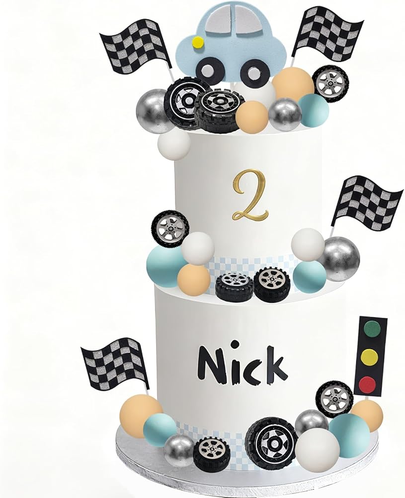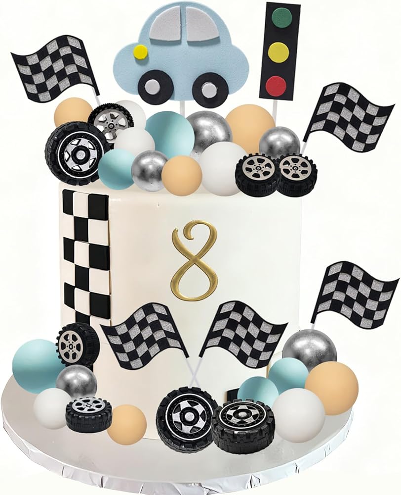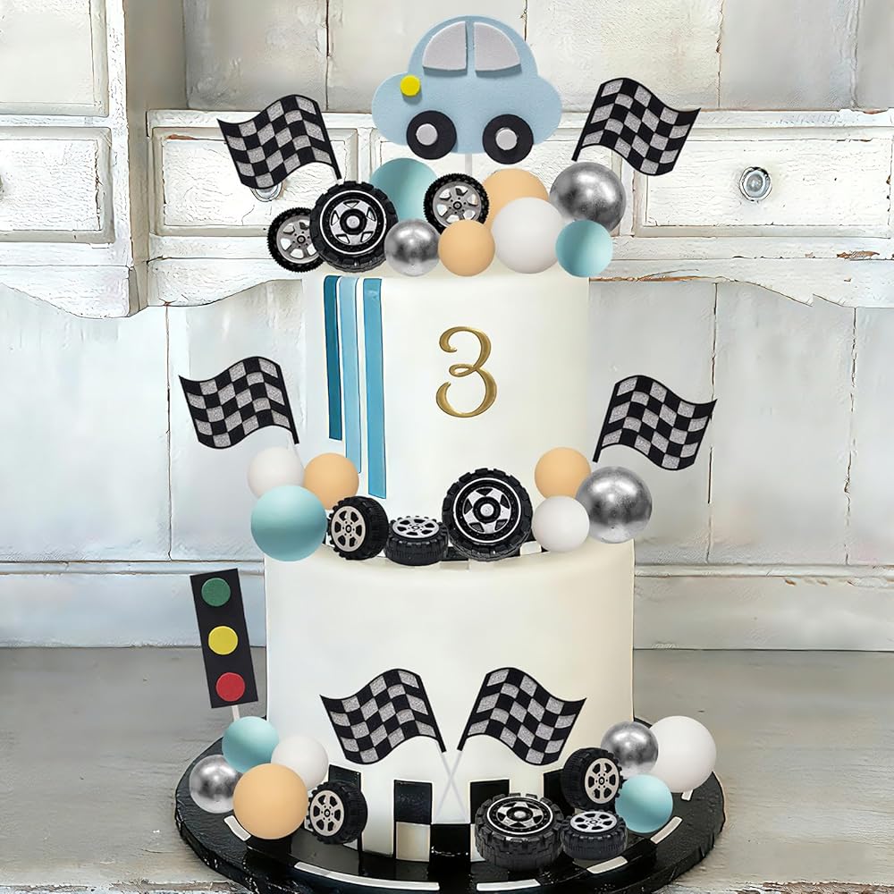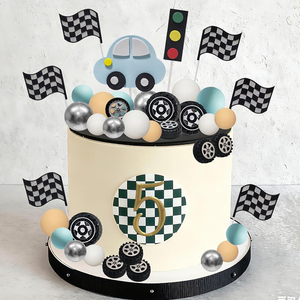 Safe Material: Car and traffic light are made of Eva. Checkered flag cake toppers are made of paper. 0-9 number cake toppers are made of acrylic. Tires are made of plastic, and ball cake toppers are made of foam