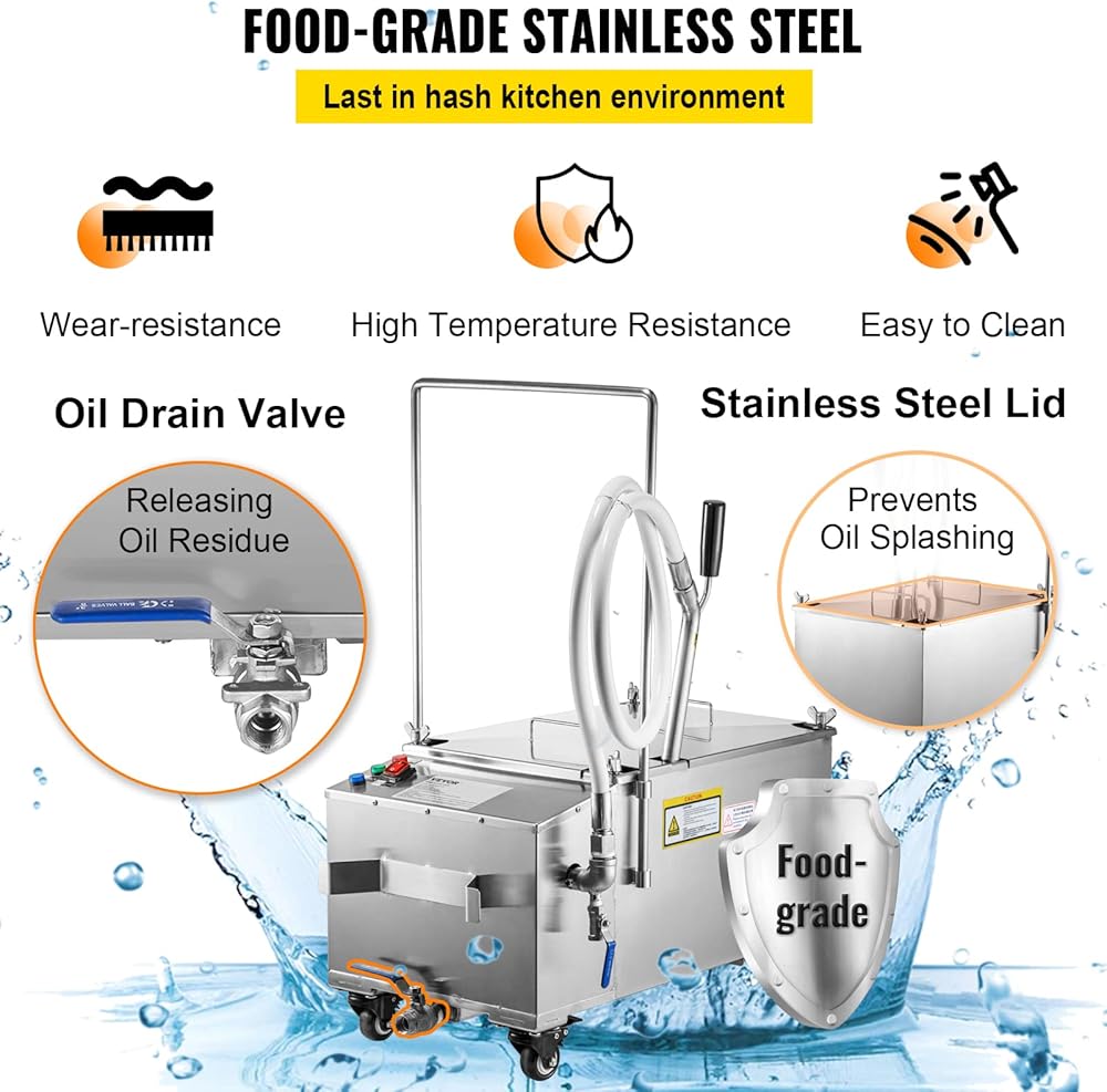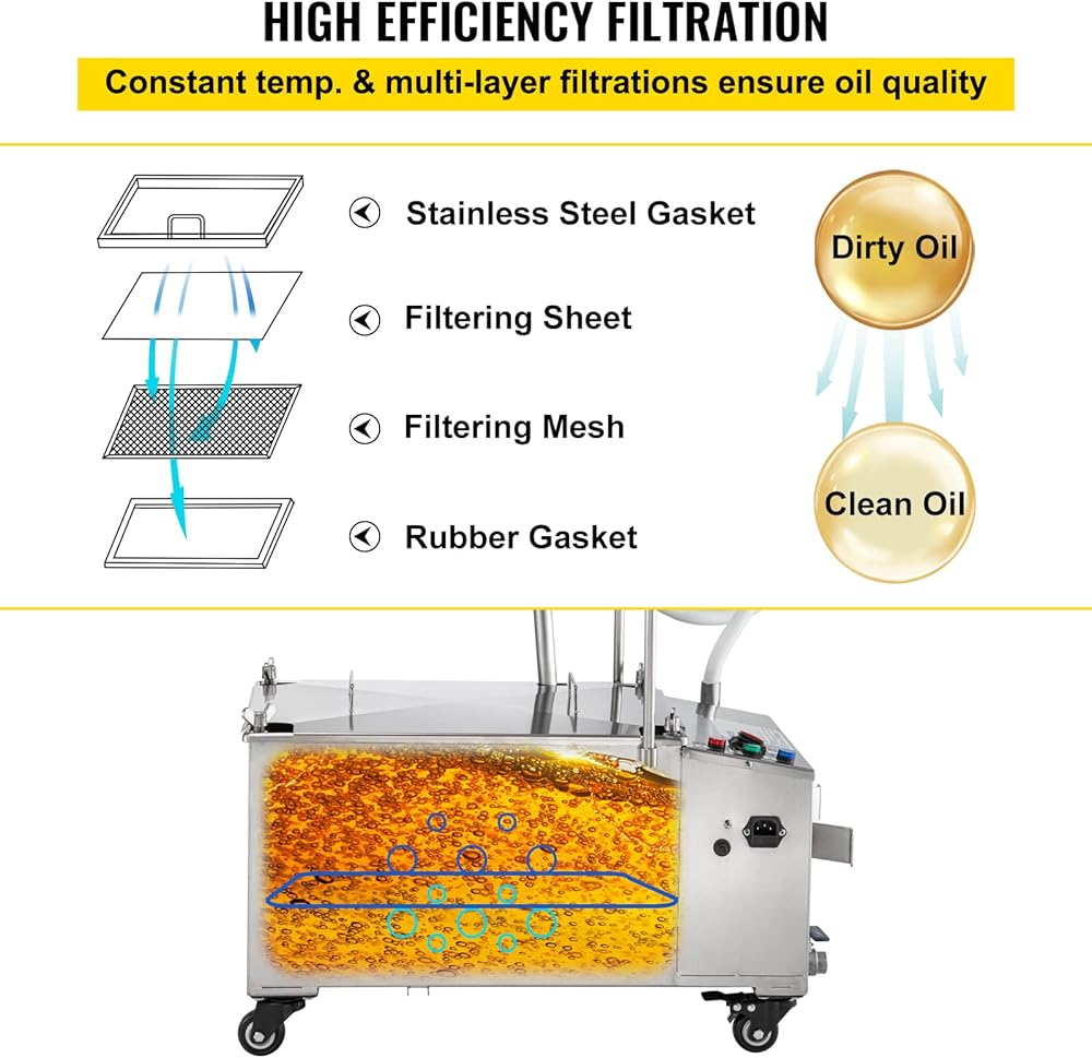 ترشيح فعال ونظيف: يحتوي فلتر المقلاة المتنقلة على طبقتين لترشيح عالي الجودة. يمكن للوحة الترشيح وشبكة الترشيح أن تتخلص بشكل فعال من الجسيمات العائمة الصغيرة والشوائب التي يبلغ قطرها أكثر من 5 ميكرون. احصل على زيت نظيف حقًا. بالإضافة إلى ذلك، يوفر نظام تسخين درجة حرارة الزيت المتقدم درجة حرارة القلي المثالية بين 248-356 درجة فهرنهايت (120-180 درجة مئوية). قم بقلي الأطعمة واستمتع بمذاق لذيذ ونظيف لم يسبق له مثيل.