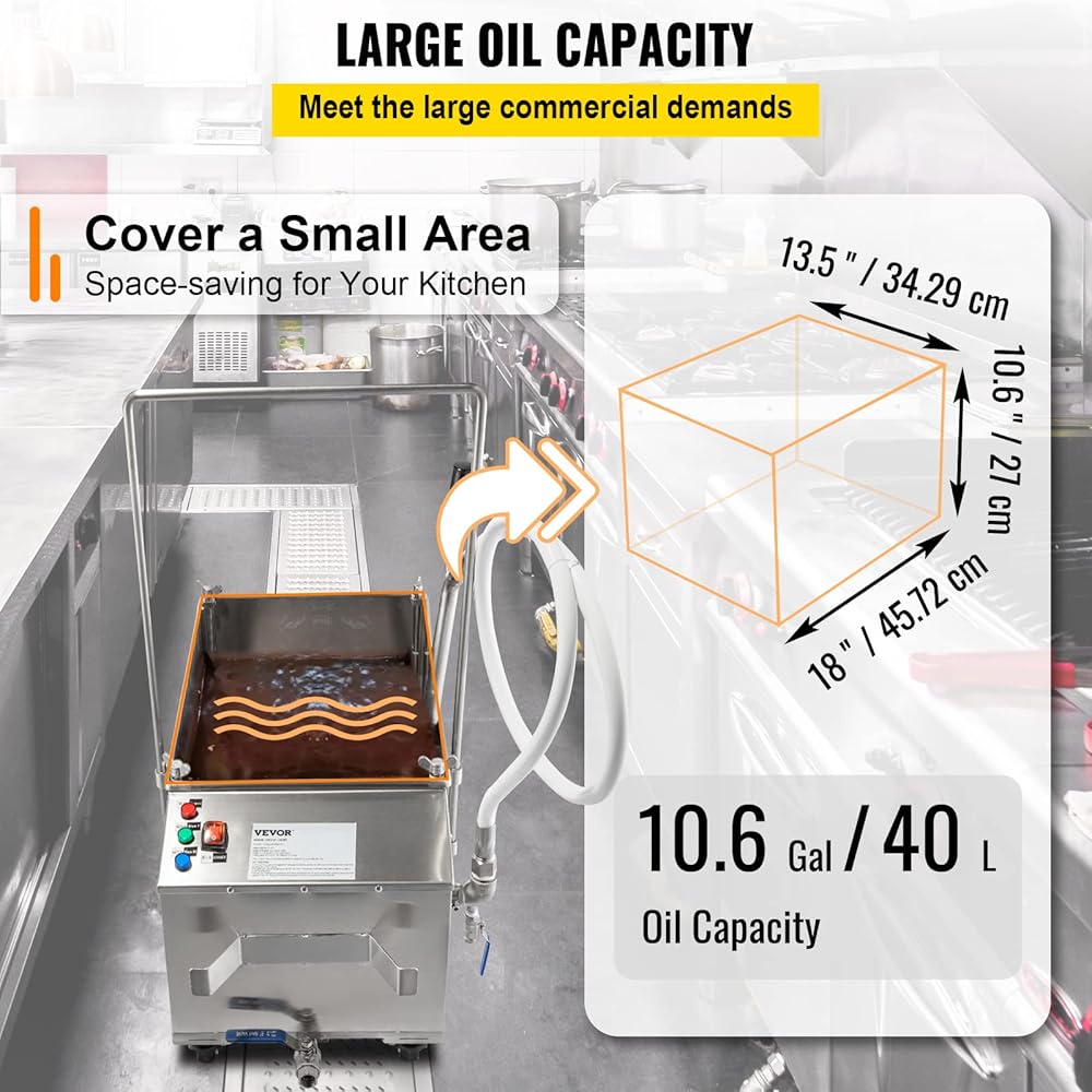 سعة كبيرة 40 لترًا: يمكن للغرفة الكبيرة استيعاب ما يصل إلى 40 لترًا (10.6 جالونًا أمريكيًا) من الزيت، بأبعاد 18 بوصة × 13.5 بوصة × 10.6 بوصة (45.72 × 34.29 × 27 سم). يغطي فلتر زيت المقلاة مساحة صغيرة المساحة وتوفر المساحة بشكل كبير، مما يجعلها مناسبة للمطابخ الضيقة.مظهر فلتر زيت القلي منخفض المظهر، لذا فهو مناسب لوضعه تحت استنزاف المقلاة.