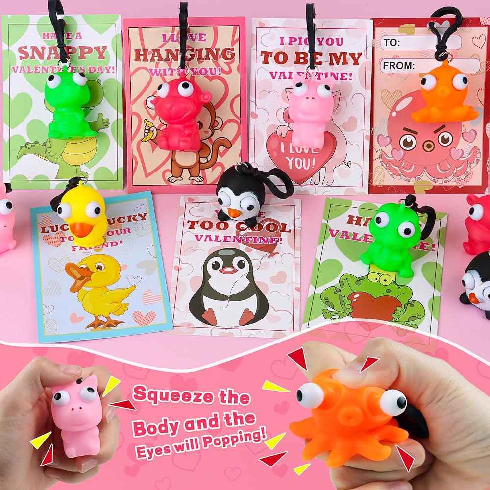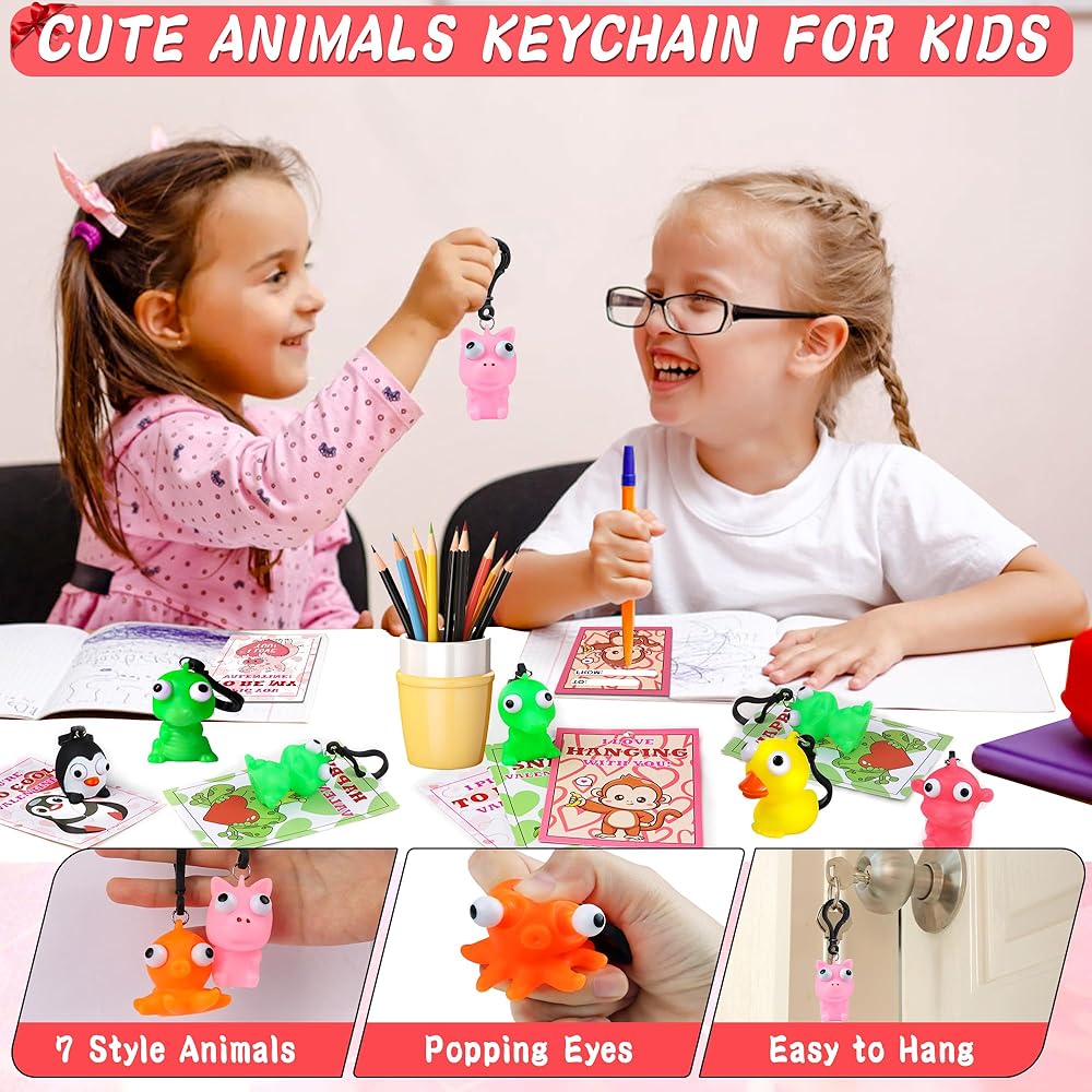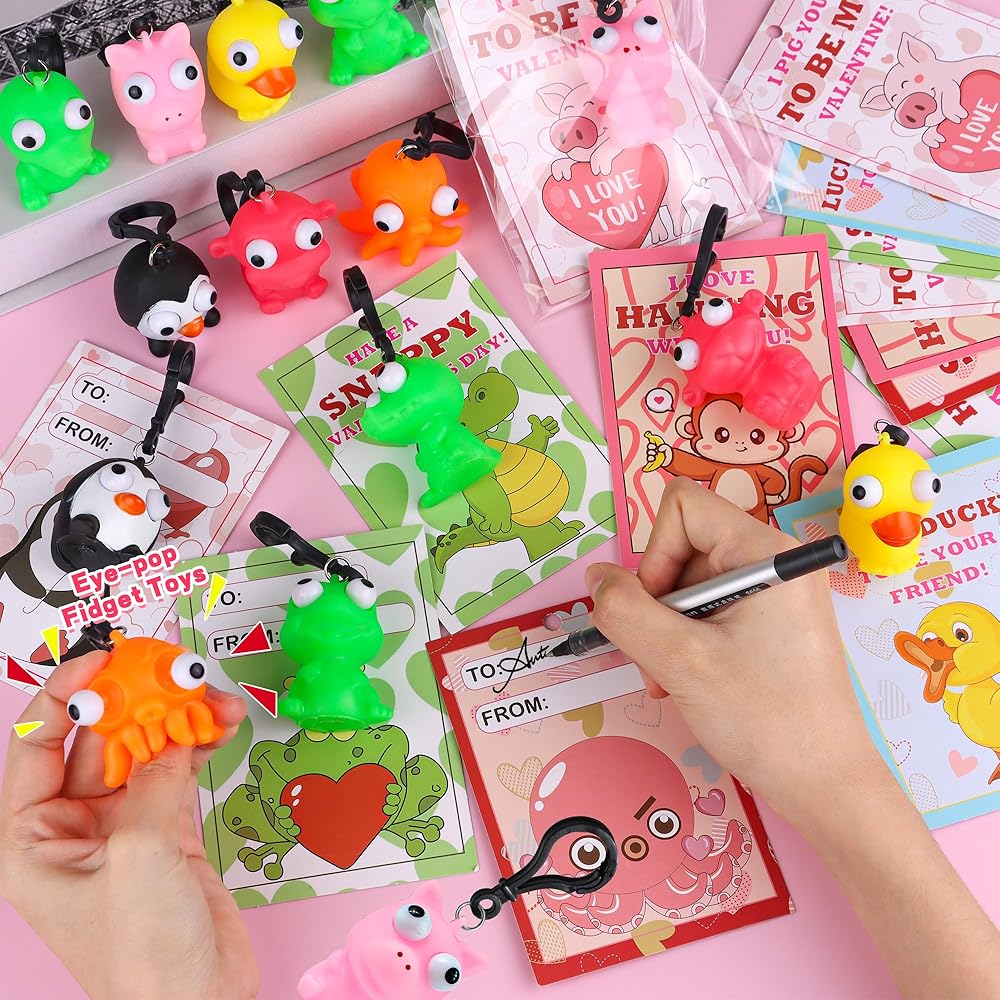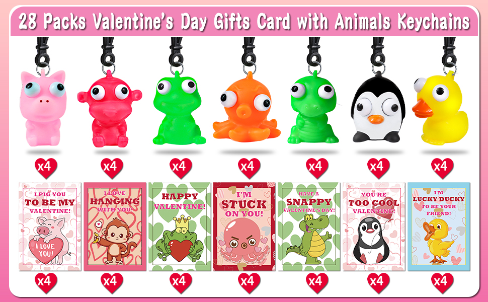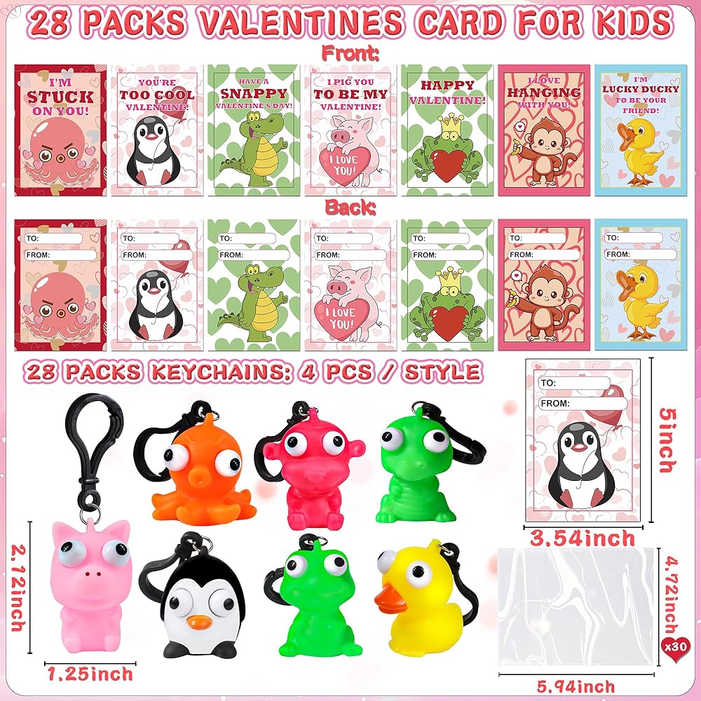 28 حزمة من بطاقات عيد الحب للأطفال في الفصل الدراسي، هدايا عيد الحب للأطفال في المدرسة مع سلسلة مفاتيح على شكل حيوانات عين البوب، مجموعة هدايا عيد الحب لفصل عيد الحب، بطاقات تبادل هدايا الحفلات