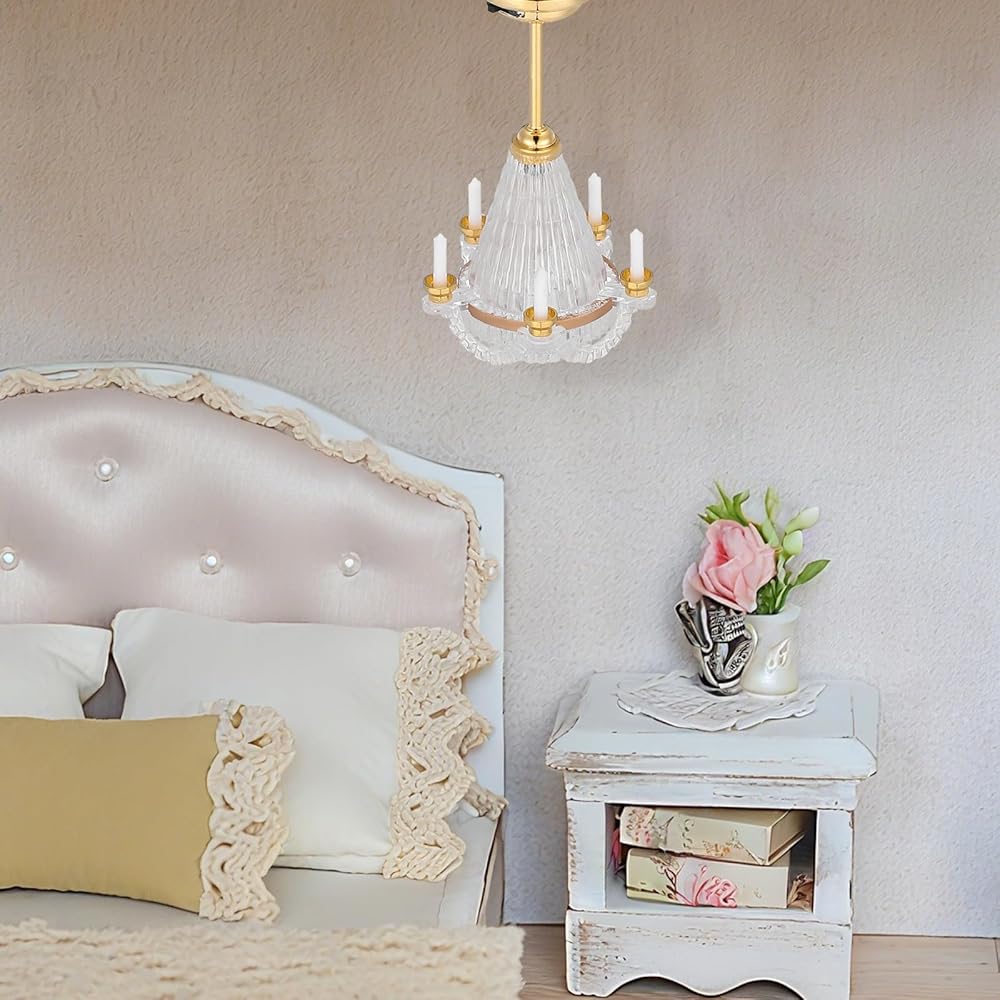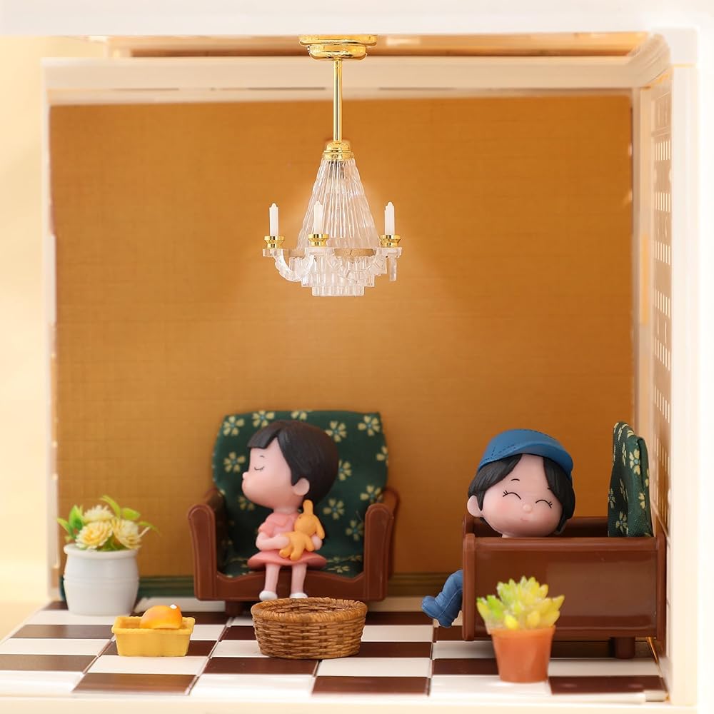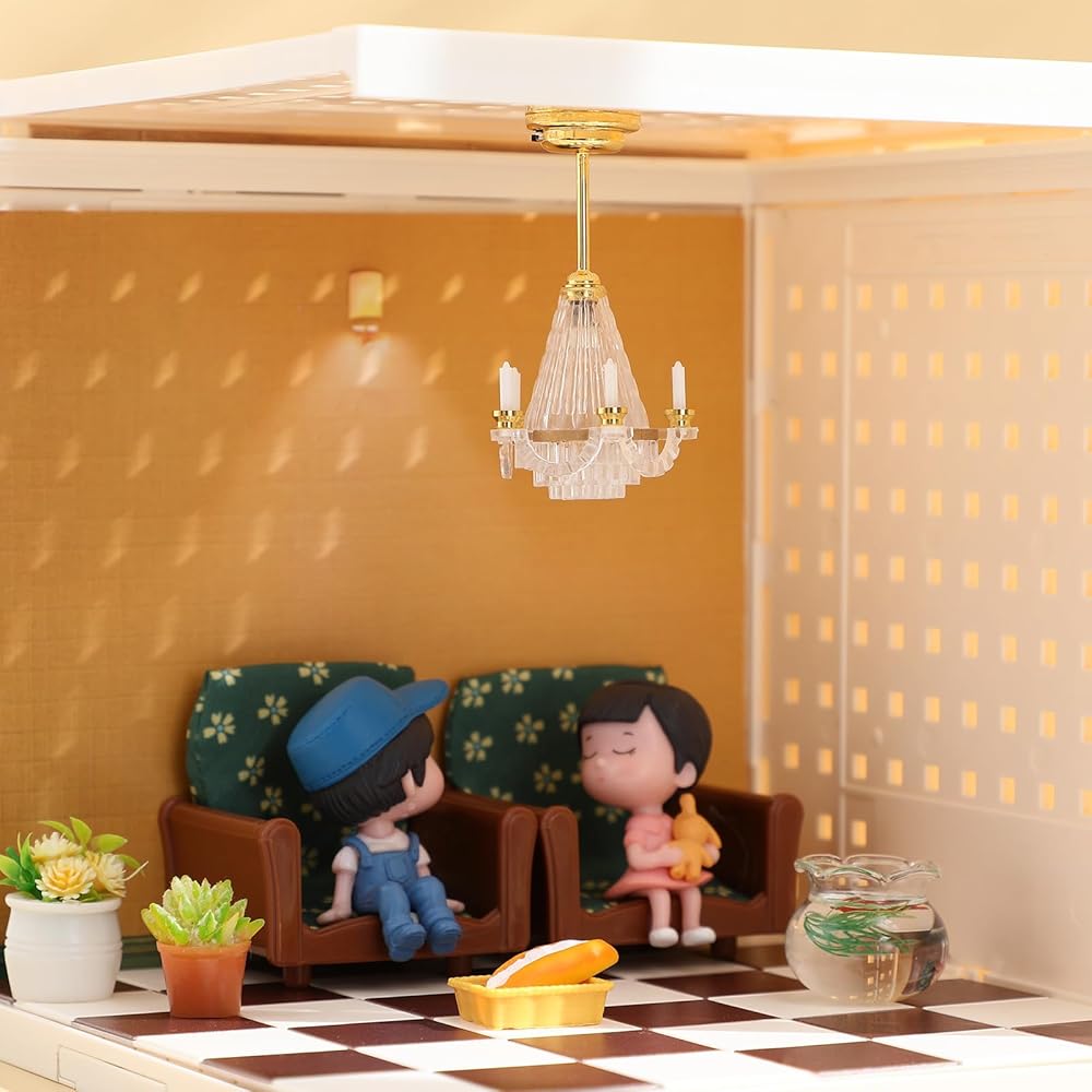 الثريا الرائعة: إكسسوارات بيت الدمى الأنيقة والحرف الإبداعية. لطيف للغاية وعمل بشكل مثالي! خطوط ناعمة وأنيقة مناسبة لأنماط مختلفة من ديكورات بيت الدمى. سواء كان الطراز قديمًا أو عصريًا، فإن هذا المصباح المتدلي يمتزج بشكل مثالي، مما يضيف لمسة من الأناقة والرومانسية إلى عالمك المصغر. يهتم تصميم الإضاءة بالتفاصيل؛ شكل الشمعة وتأثير الإضاءة وهيكل التثبيت المدروس